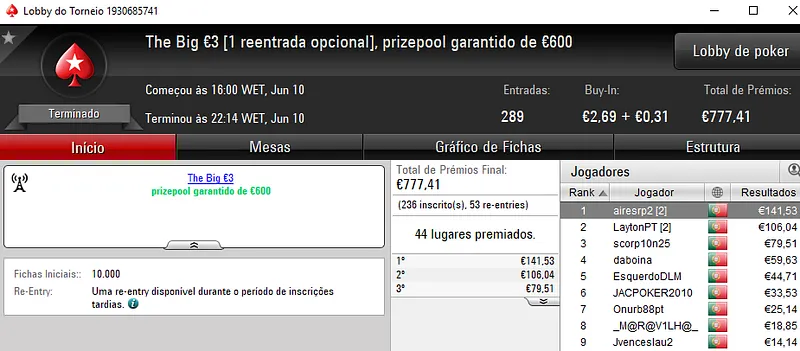 O The Big €100 com 24 entradas ficou marcado pelo overlay registado e também pelo acordo realizado no 3-handed. HakunaHak acabou por receber o maior prémio, cerca de €701. Na segunda posição, bebecas0 garantiu €612, e no terceiro lugar, joypoker125 arrecadou €610.