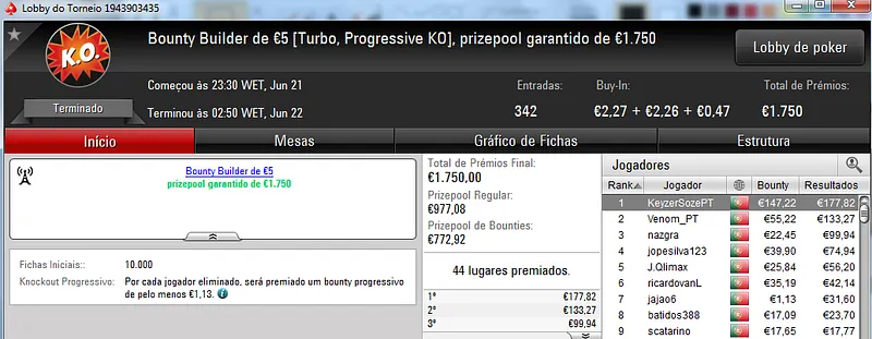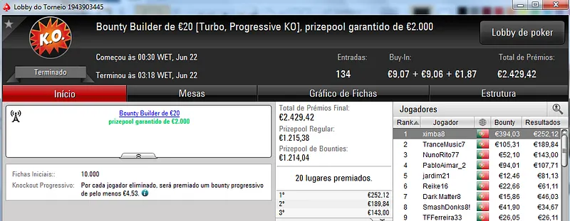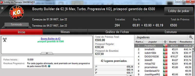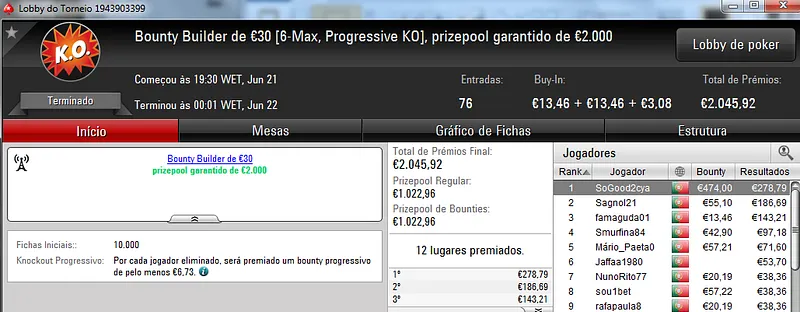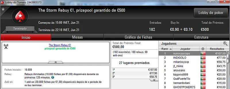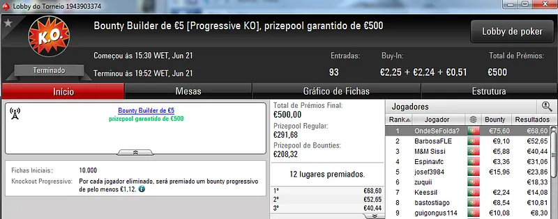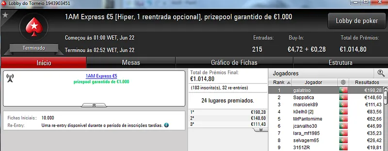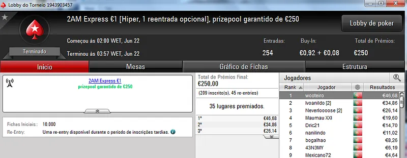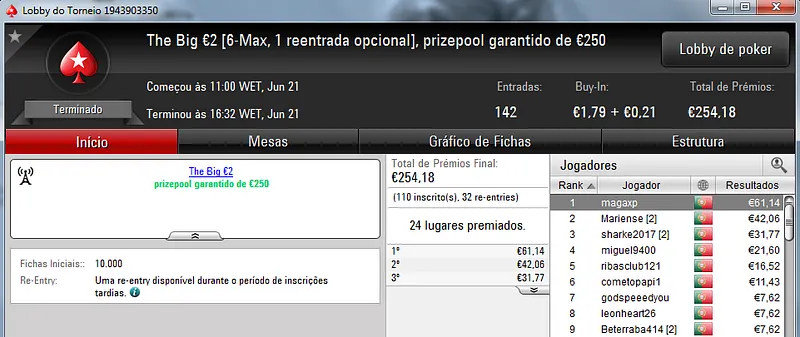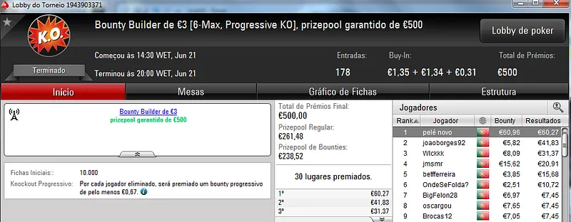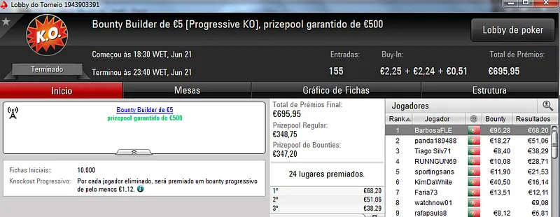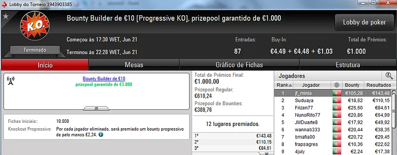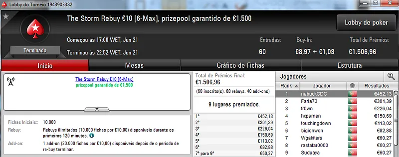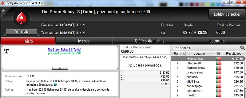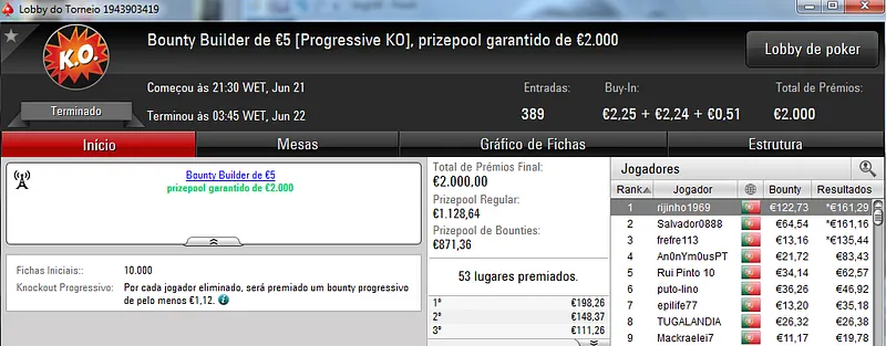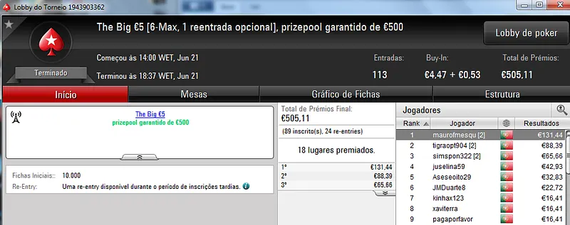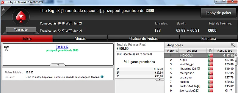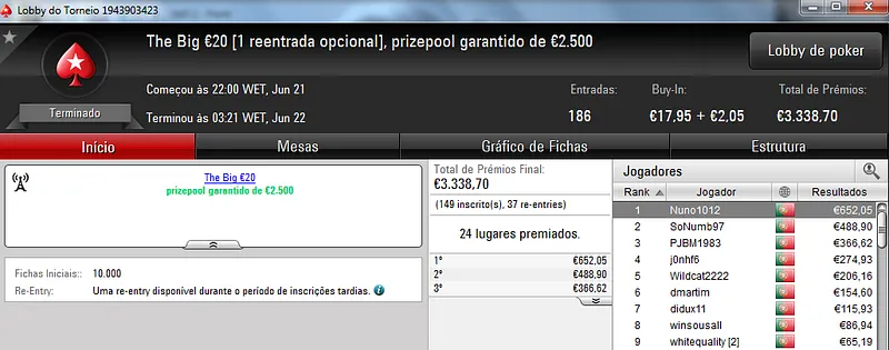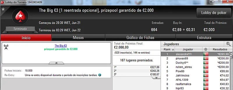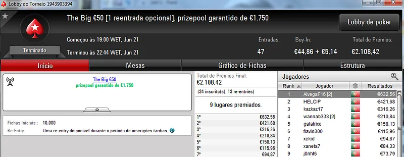Já Fábio 'wannab333' Dâmaso terminou no terceiro lugar, recebeu €713 e ainda deu cartas em mais dois torneios onde encaixou €329. Foi quarto no The Big €50 para €210 e recebeu mais €119 no The Big €10.