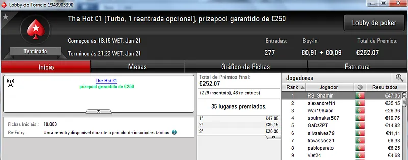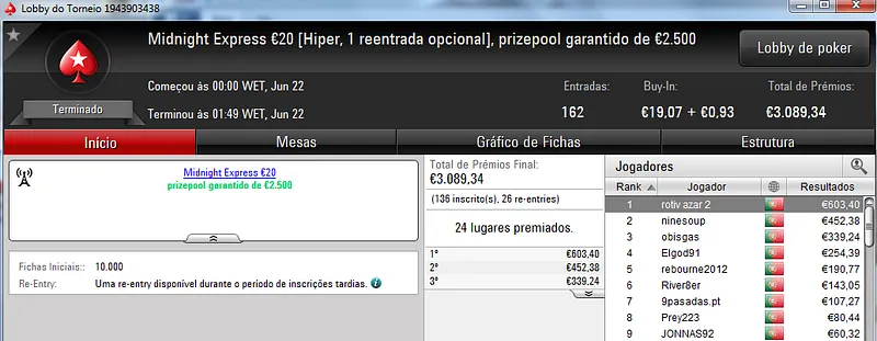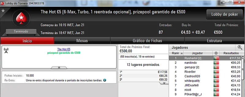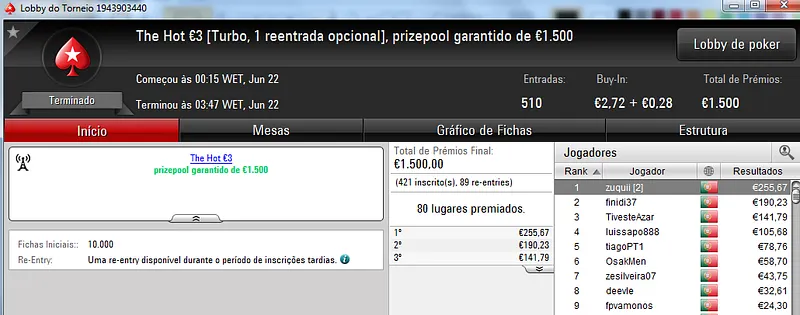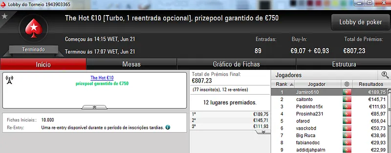 O maior prémio da noite ficou reservado para MysticLie6 que foi o campeão do The Hot BigStack Turbo €50, torneio com 121 entradas. MysticLie6 recebeu €1,426 de prémio dos €5,484 de prize pool acumulado. JonnhyBet^^ ficou próximo dos 4 dígitos e faturou €959 pelo segundo lugar.