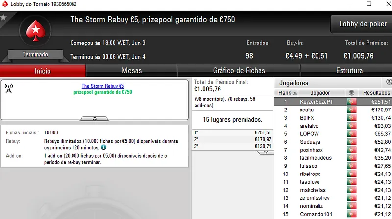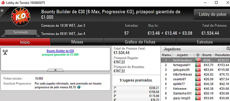 famaguda01 chegou mesmo a ultrapassar a barreira dos 4 dígitos ao terminar o Bounty Builder de €30 na 2ª posição para receber mais €153 de prémio e €43 em bounties. Acumulou €1.151 nestes dois torneios.