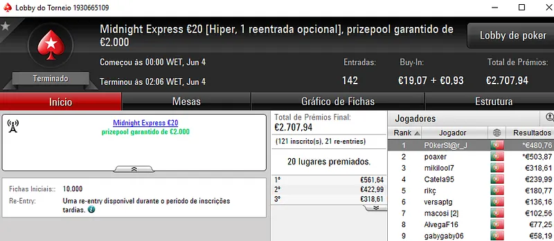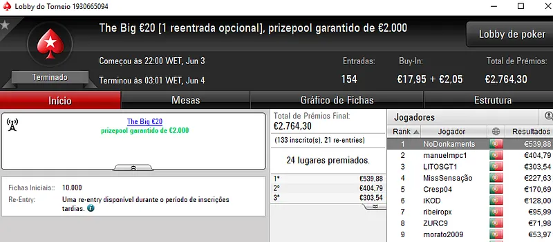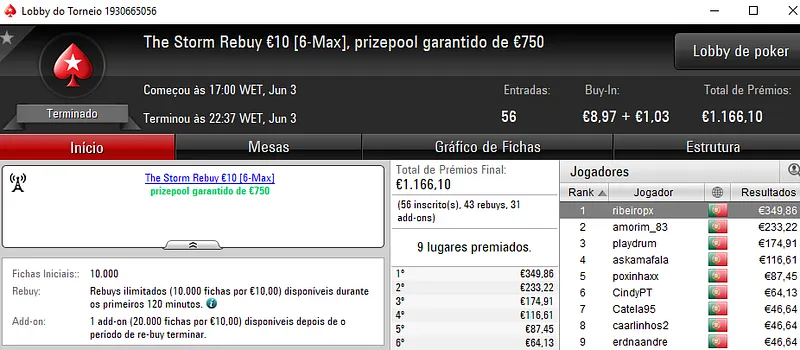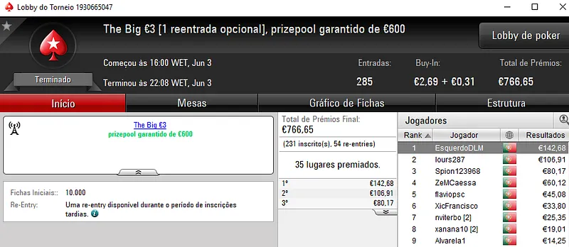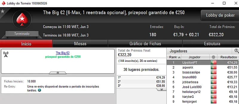 Pedro "jgrhajsj" Cabeça e famaguda01 chegaram a acordo no heads-up e receberam €955 cada. O torneio contou com 34 entradas e o prize pool de €3,082 foi distribuído pelos 6 melhores classificados. Na terceira posição, LegendLIS encaixou €462.