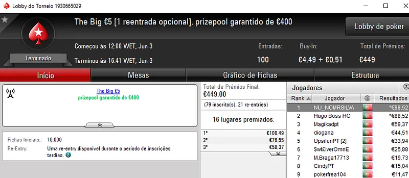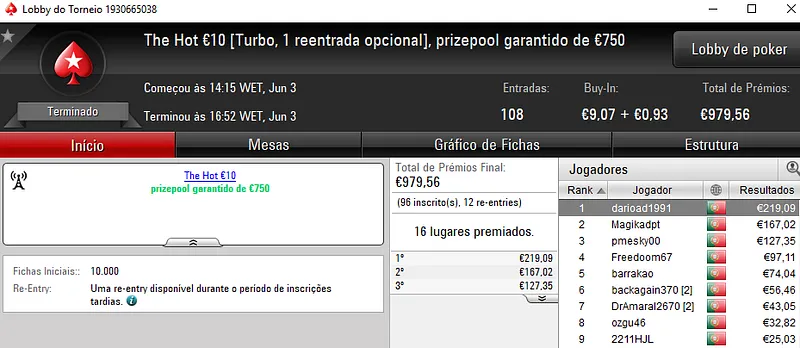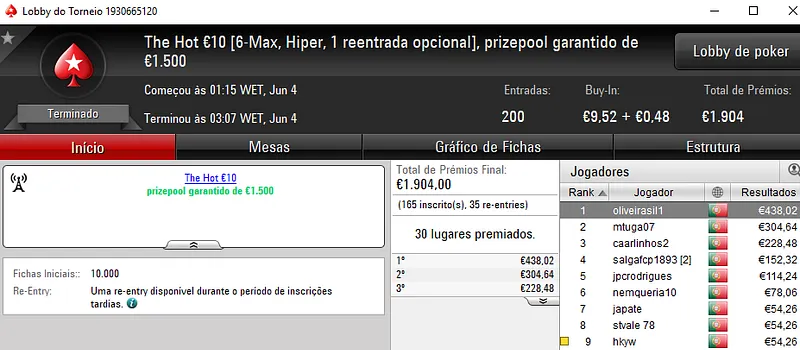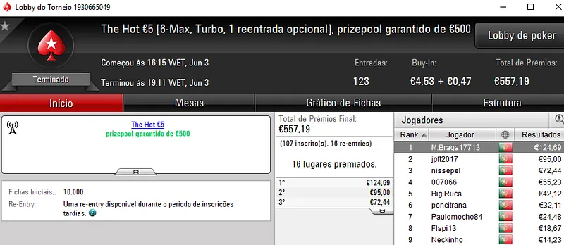 O The Hot BigStack Turbo €50 teve a participação de 52 jogadores, com 9 desses jogadores a realizarem a opção de reentrada. Um dos jogadores que voltou a entrar no torneio foi igorpintas que acabou por se sagrar campeão e levar para casa €829. Na segunda posição, todomingos recebeu €553 e a fechar o pódio, AAorAA7 levou €414.