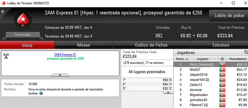 Ontem, dois jogadores dividiram o maior prémio da sessão de poker online na PokerStars.pt.