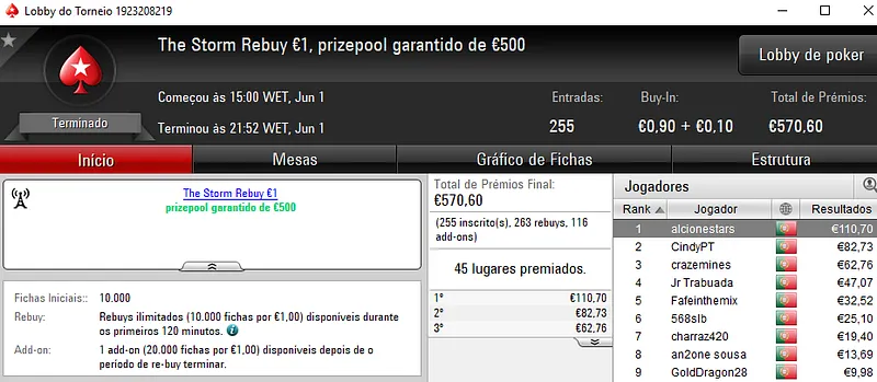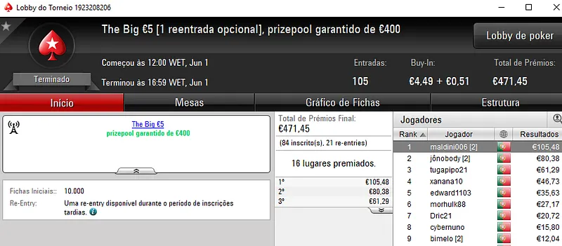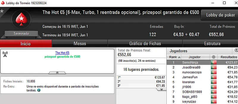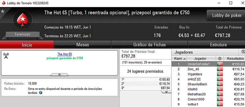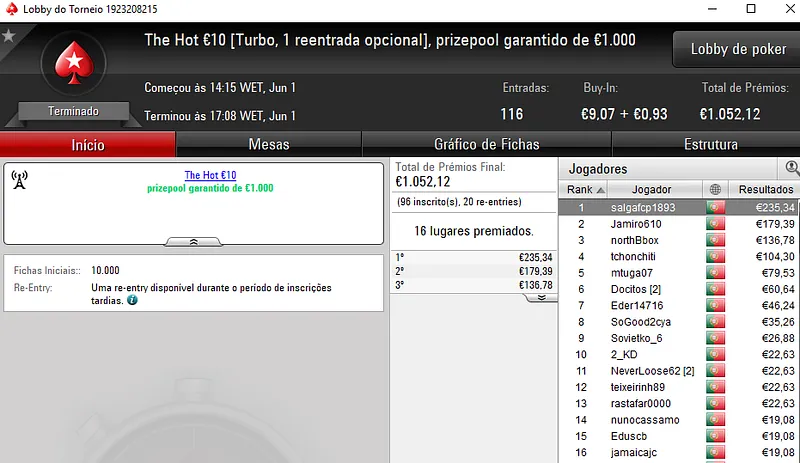 Depois de ter conquistado o The Big €100, na quarta-feira, OTENknows voltou à carga e venceu o Hot BigStack Turbo €50. O filed com 108 entradas não foi problema para OTENknows que encaixou €1,272 dos €4,895 de prizepool acumulado. Destaque ainda para o segundo posto de xaneta7 que recebeu €856, e para Angola_1974 que levou €636 pelo terceiro lugar.