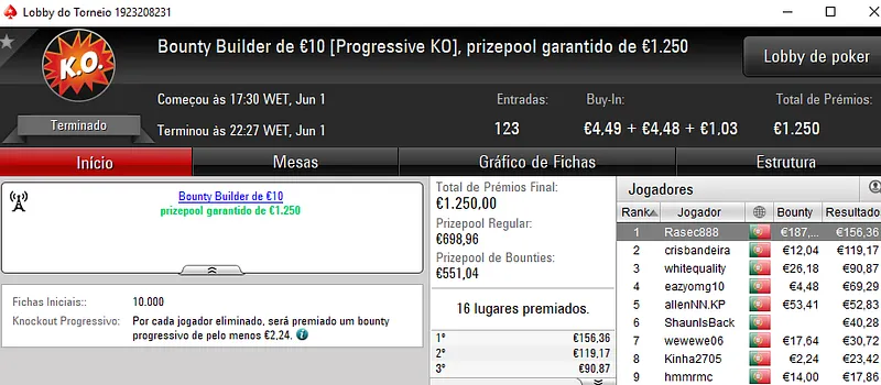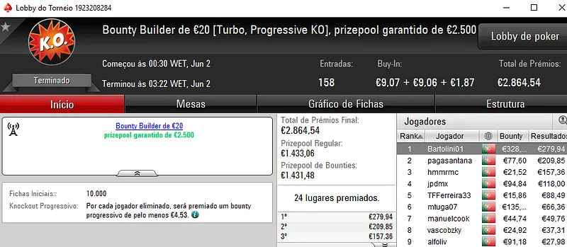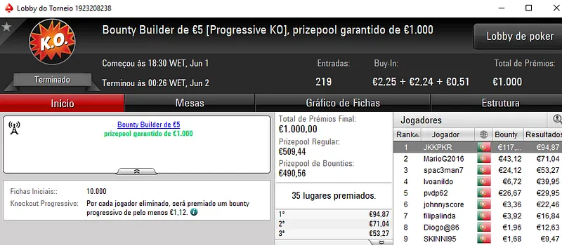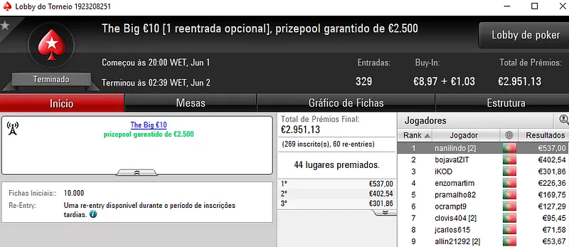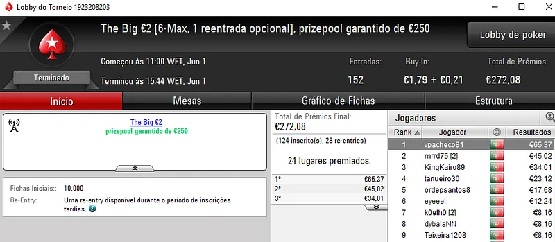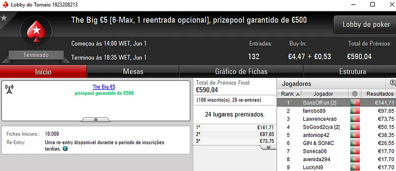 Já no The Big €20 com 199 entradas e €3.572 de prizepool, assistimos a nova vitória de jensjensen4 que amealhou mais €697. Bartolini01 perdeu no heads-up e levou para casa €523. Na terceira posição, PJBM1983 recebeu €392.