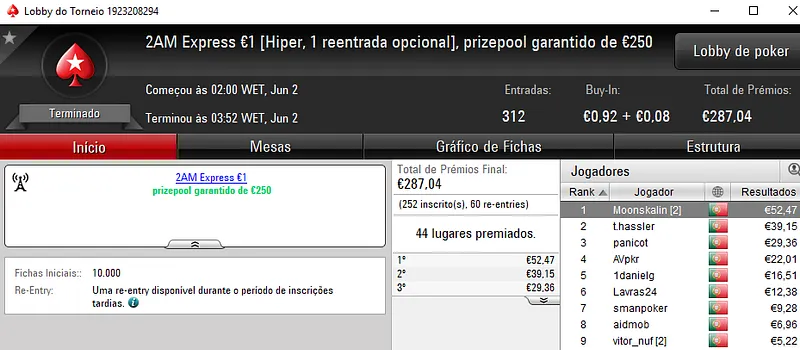 Sem grandes surpresas, ontem foram distribuídos mais dois prémios de 4 dígitos na PokerStars.pt. A sala da espada vermelha nacional continua a ser bastante procurada e o grande vencedor de ontem foi jensjensen4 que amealhou mais de €2.338 em três torneios regulares.