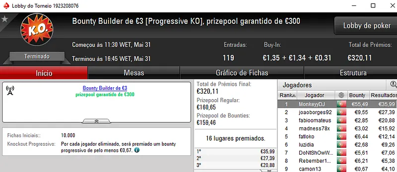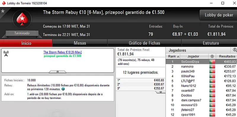 No topo da classificação terminou OTENknows que encaixou €1.414 pela vitória. No segundo posto, Fábio "wannab333" Dâmaso levou para a sua conta €942 e a completar o pódio Pedro "jgrhajsj" Cabeça recebeu €707.