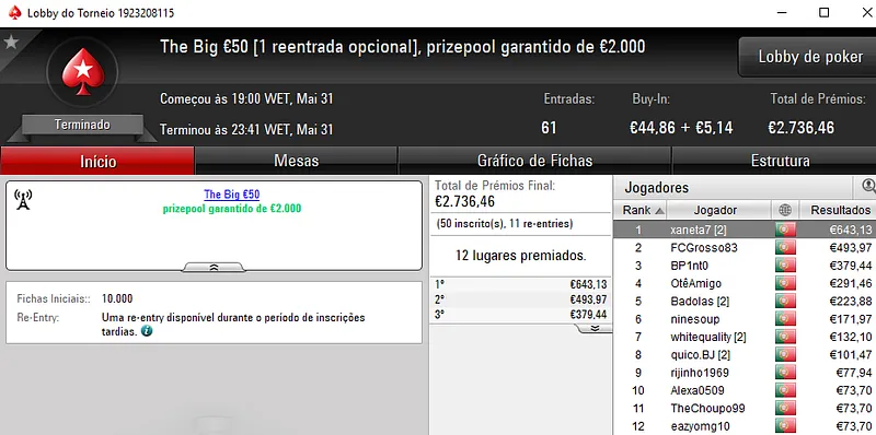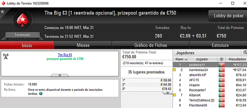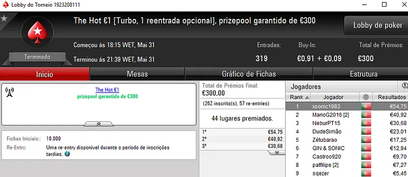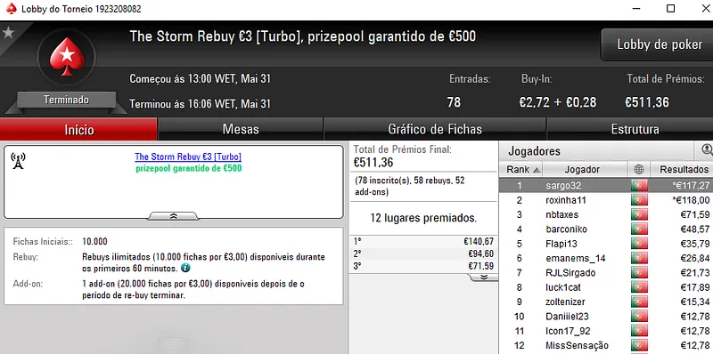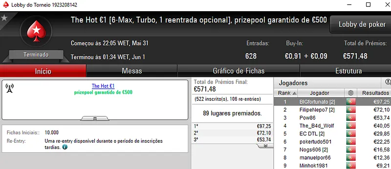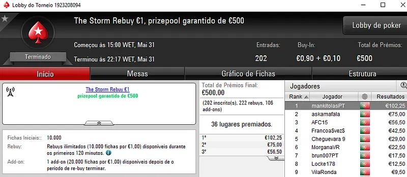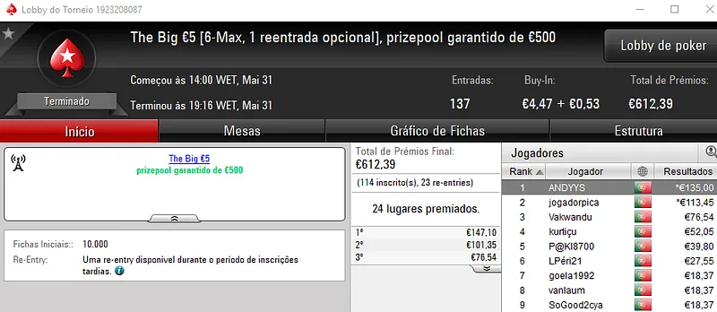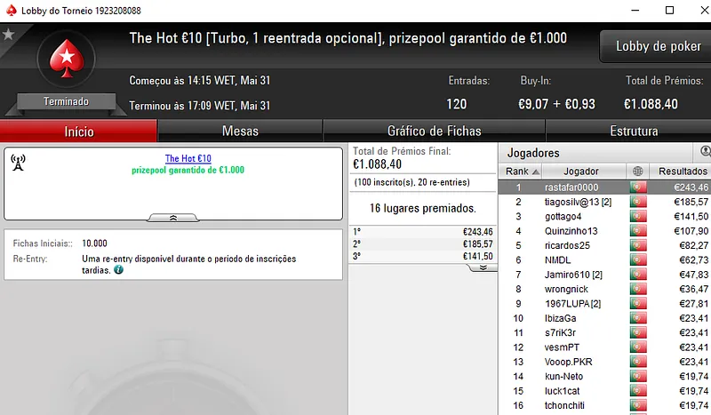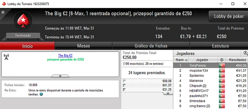 Este torneio teve um field de 154 entradas e o prize pool chegou aos €5.620. Para o primeiro classificado estavam reservados €1.461 e foi esse o prémio que Ricardo recebeu depois de vencer Catela95 no heads-up (€983). Os dois finalistas usaram a opção de reentrada no torneio e pelos prémios que receberam foram bem recompensados.
