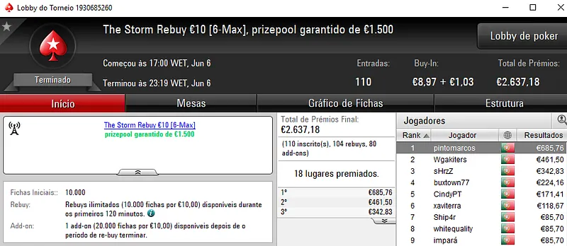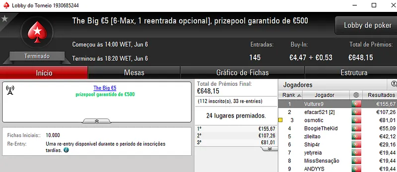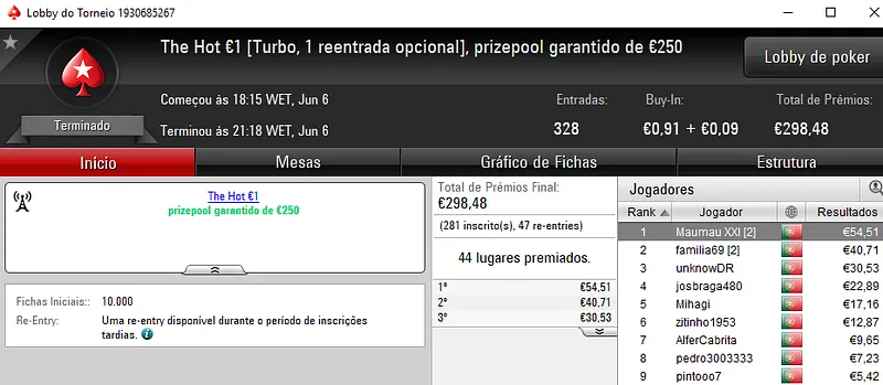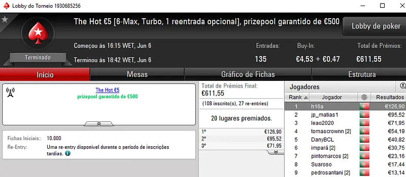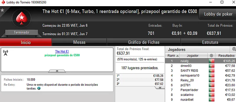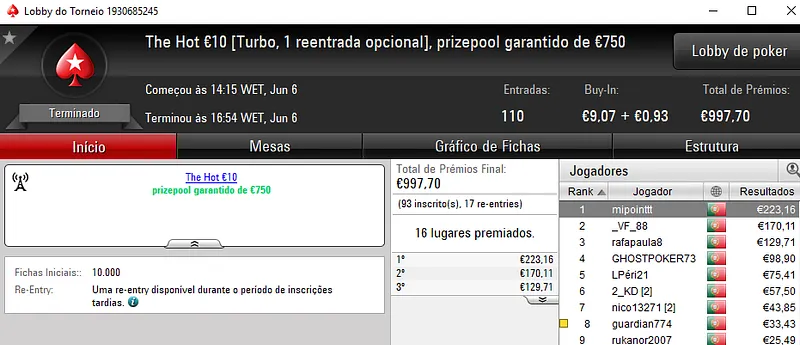 Já xaneta7 saiu com o título no The Hot BigStack Turbo €50 para receber €1,588. Este torneio contou com 112 jogadores que realizaram 34 reentradas. O prize pool chegou aos €6,618 e os prémios foram distribuídos pelos 24 melhores jogadores. TheChoupo99 voltou a brilhar e acrescentou mais €1,095 (€2,065 no total) à sua conta depois de perder no heads-up com xaneta7. Na terceira posição, v@gitarian amealhou €827 (e ainda ganhou o Super Tuesday Big €10 para €1,094).