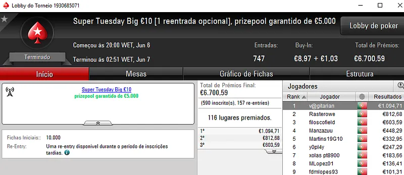 No Super Tuesday Battle €30 com 210 entradas, o campeão jumbojane recebeu €1,552 de prémio. Na segunda posição, iKOD arrecadou €441. Já xivita76 amealhou €524, entre prémios e bounties.