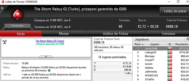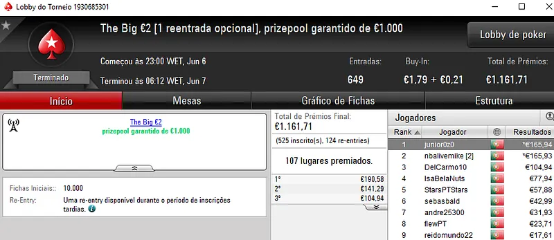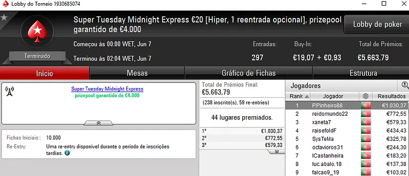 Como acontece todas as terças-feiras, a estrela do dia foi Super Tuesday €100 que contou 108 entradas realizadas pelos 85 participantes. O prize pool atingiu os €9,790 e os prémios foram distribuídos pelos 16 melhores classificados. Com o maior prémio do torneio, e também da noite, ficou rogi1000 que levou para casa €2,189. Na segunda posição, puto59 recebeu €1,669 pela sua boa prestação. A fechar o pódio, casal city amealhou €1,272. Destaque ainda para TheChoupo99 que recebeu €970 pelo quarto lugar.