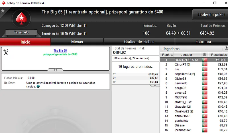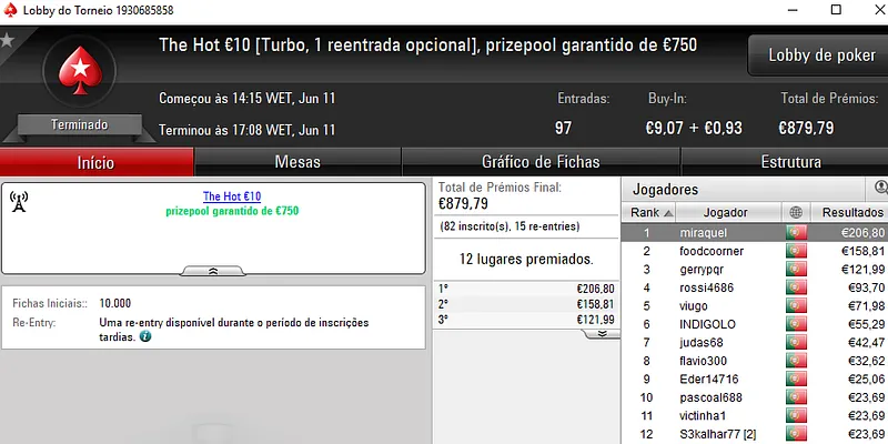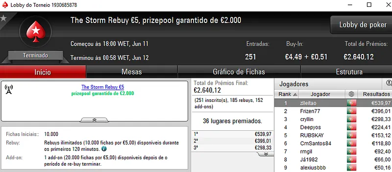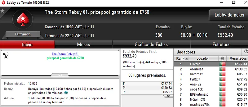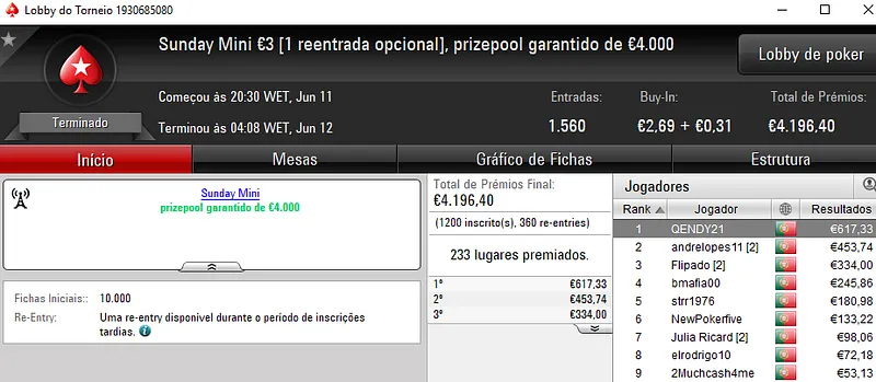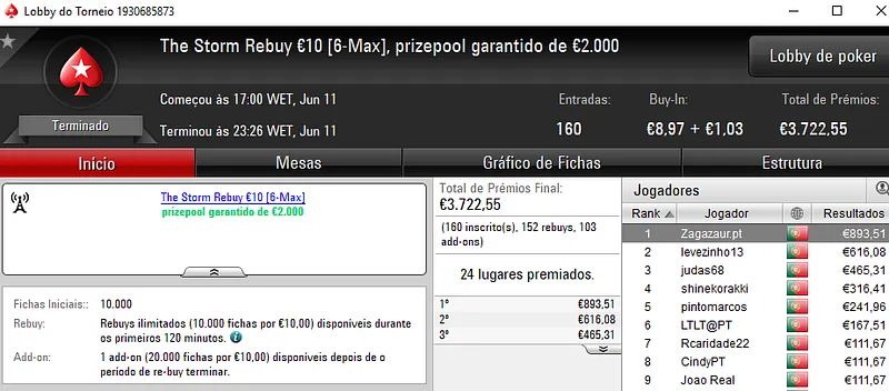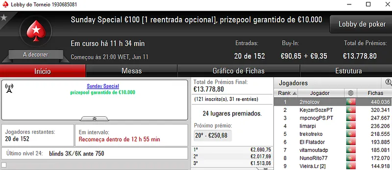 No dia de hoje vão-se resolver o Sunday Storm €10 e o Sunday Special €100, em jogo estão mais de €23 mil.