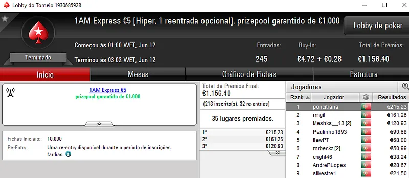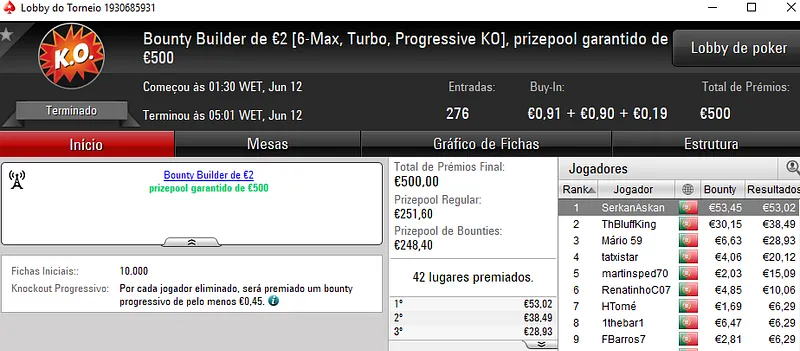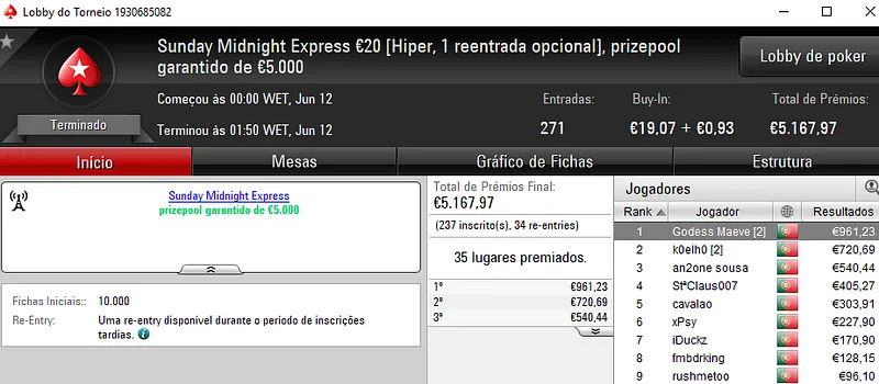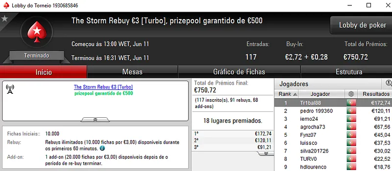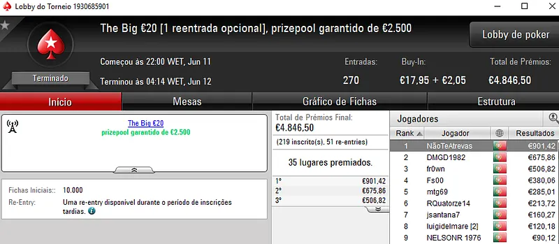 Acordo no heads-up ditou a divisão de prémios com os dois jogadores a saírem com €1,356 de prémio, cada. DanielTavars e S3kalhar77 foram os dois jogadores que terminaram o torneio no topo da classificação. Jaffaa1980 saiu no terceiro posto e arrecadou €871. O torneio contou com 177 entradas que perfizeram o prize pool de €7,940.