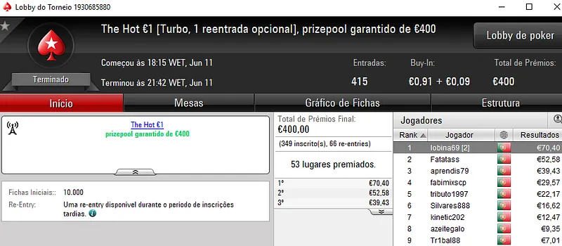 O maior prémio do dia foi para TheChoupo99 que venceu o The Hot BigStack Turbo €50 para arrecadar €1,816. Este torneio contou com 137 jogadores inscritos que realizaram 30 reentradas. O prize pool chegou aos €7,570 e foi distribuído pelos 24 melhores jogadores. TORNAD0TONI perdeu no heads-up e recebeu €1,252. No terceiro posto ficou rmgil que encaixou €946.