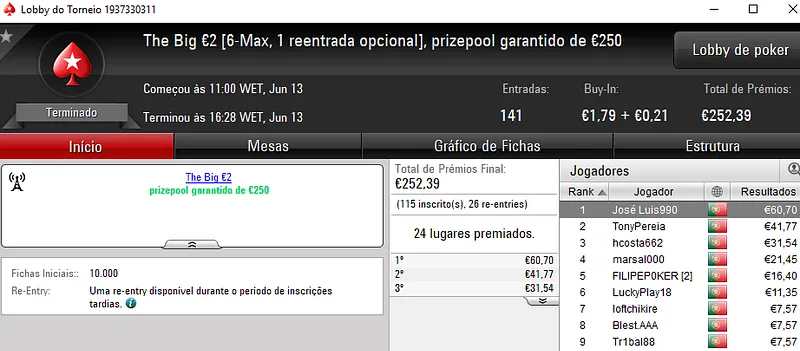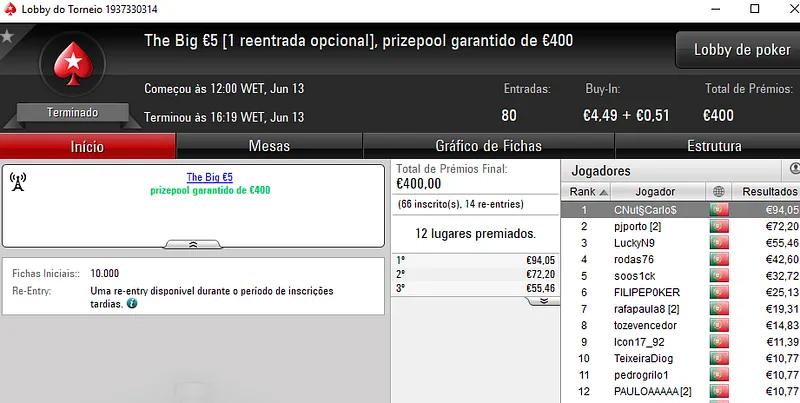 60NoPau foi o melhor no Super Tuesday Big €10 e recebeu €1,009. O torneio registou 687 entradas e no segundo posto terminou chamalouco que levou €749 de prémio. Já Snider90 recebeu €556 pelo terceiro lugar.