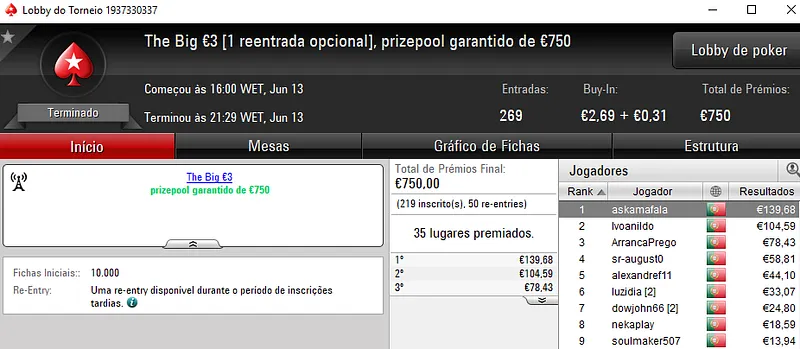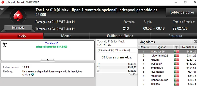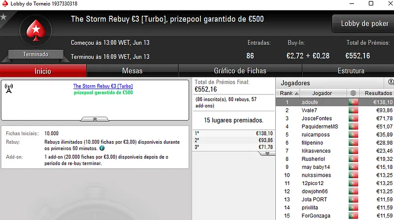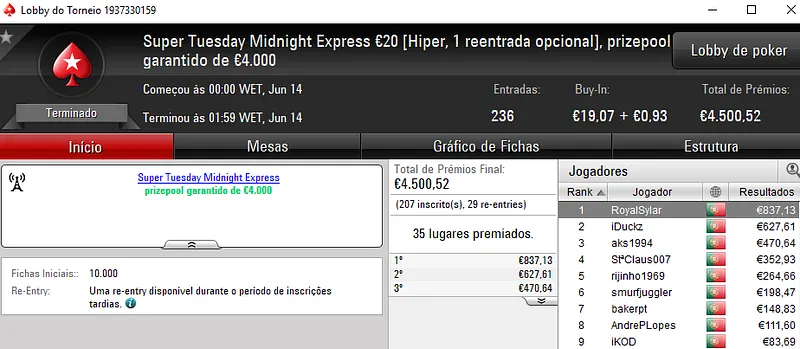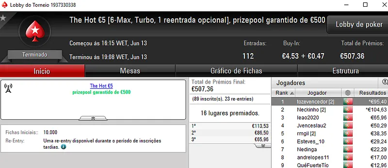 Quem também saiu com um prémio de 4 dígitos foi chilipe22 que venceu o Super Tuesday Battle €30 com 198 entradas. Pela vitória recebeu €1,108. No segundo lugar, cmcazevedo faturou €528, enquanto xcizions levou €387 em terceiro.
