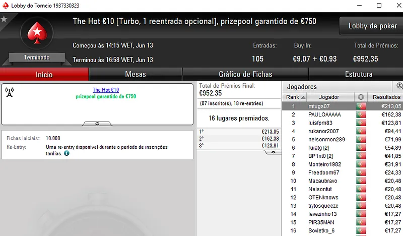 O The Hot BigStack Turbo €50 voltou a entregar um grande prémio. O torneio contou com 129 registos e o prize pool chegou aos €5,847. Na primeira posição, dealerzon recebeu €1,403 de prémio. Tavirajoao23 perdeu no heads-up e encaixou €967. A fechar o pódio, xaneta7 levou €730.