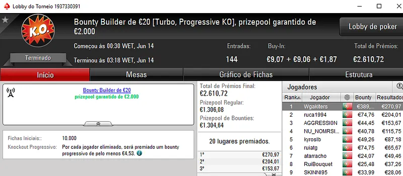 Este não foi o único resultado de relevo de Wgakiters que ainda venceu o Bounty Builder €20 para receber mais €659, e ficou na terceira posição no The Big €20 que lhe valeu €386. No total, faturou nestes 3 torneios €2,834.