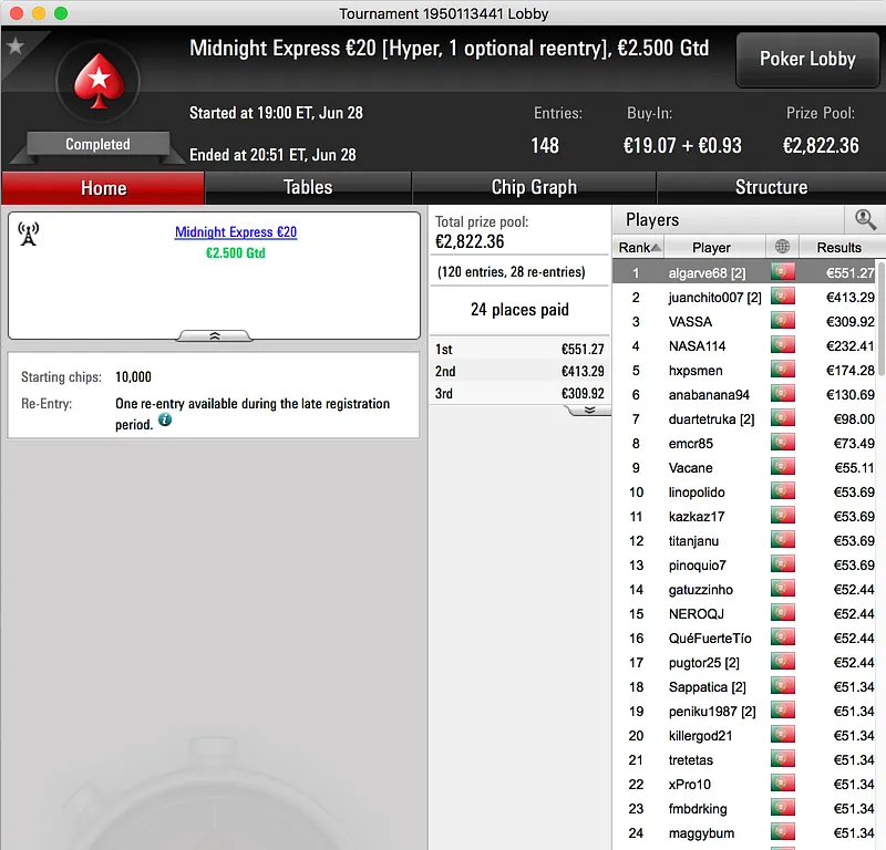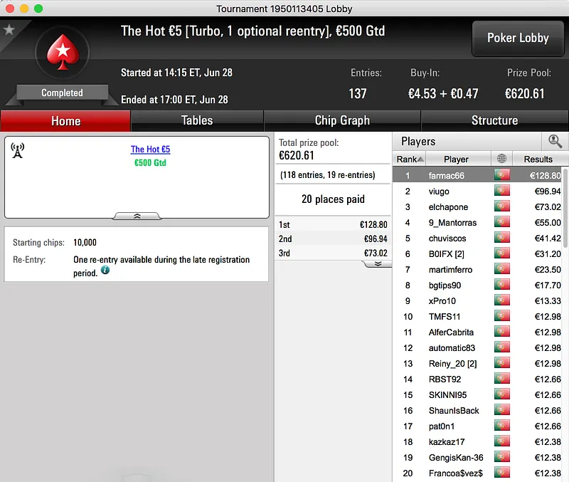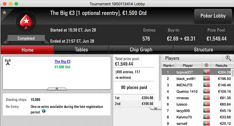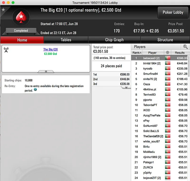 A sessão de quarta-feira da PokerStars.pt fica marcada pelo cancelamento do The Big €100. À parte disso, o maior prémio foi alcançado por xerife1987 (€1.202) após vencer o The Hot BigStack Turbo €50.