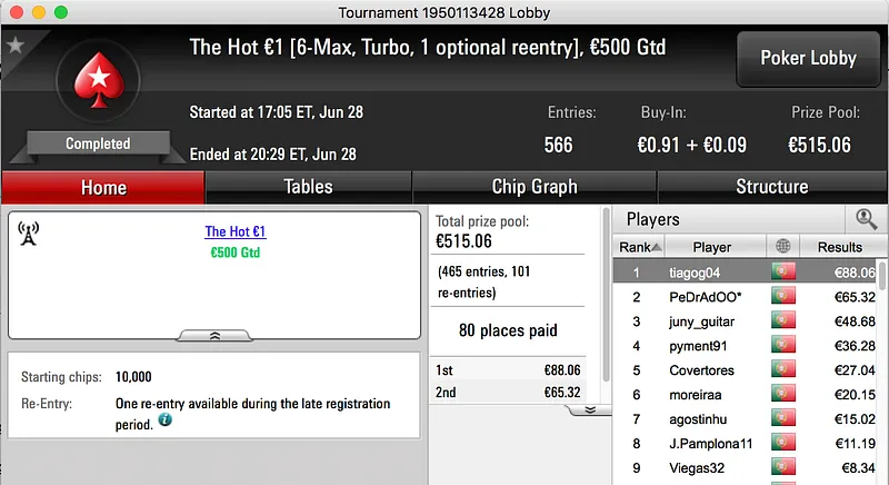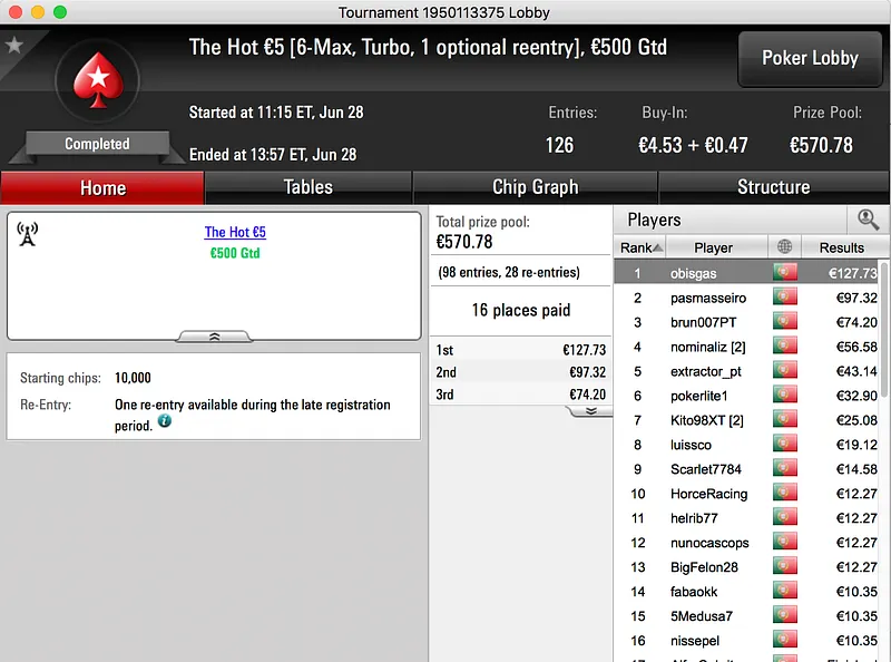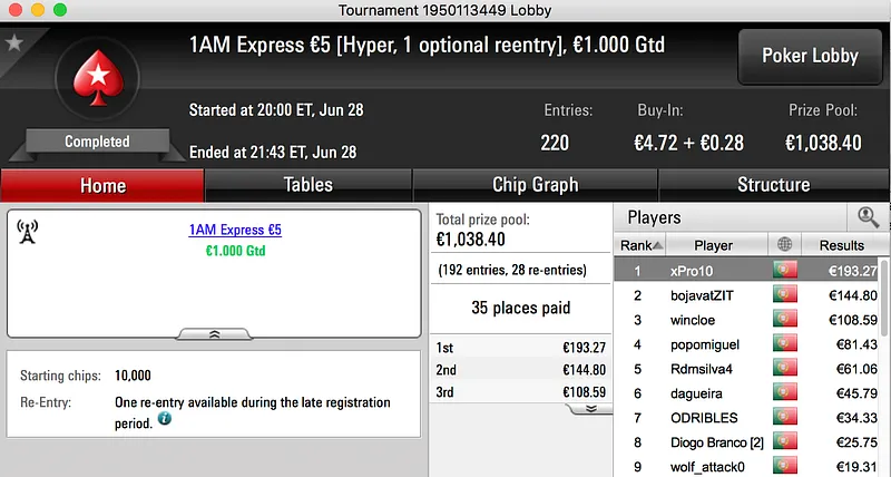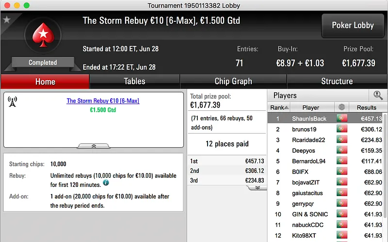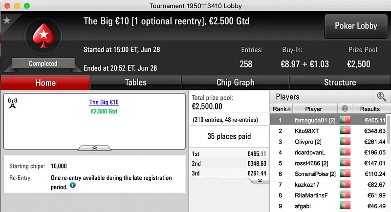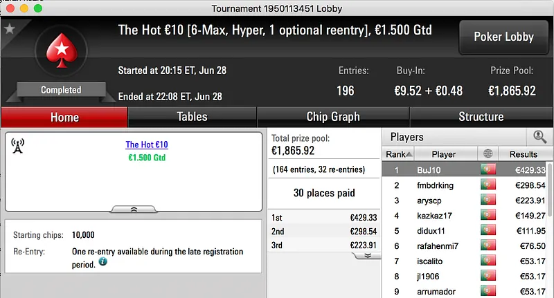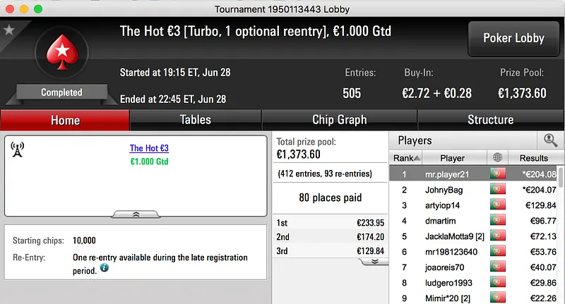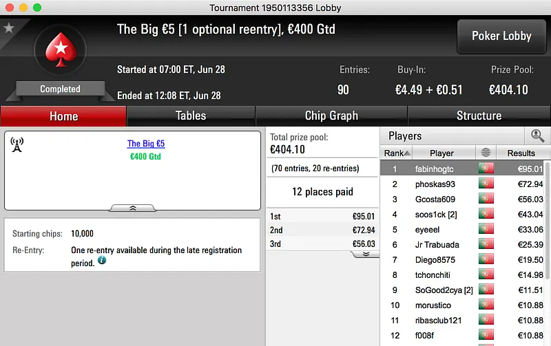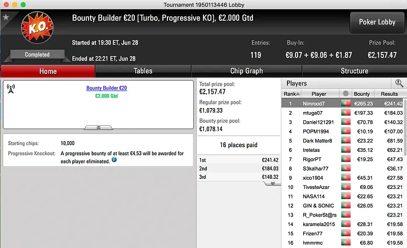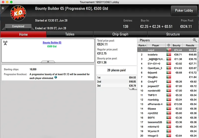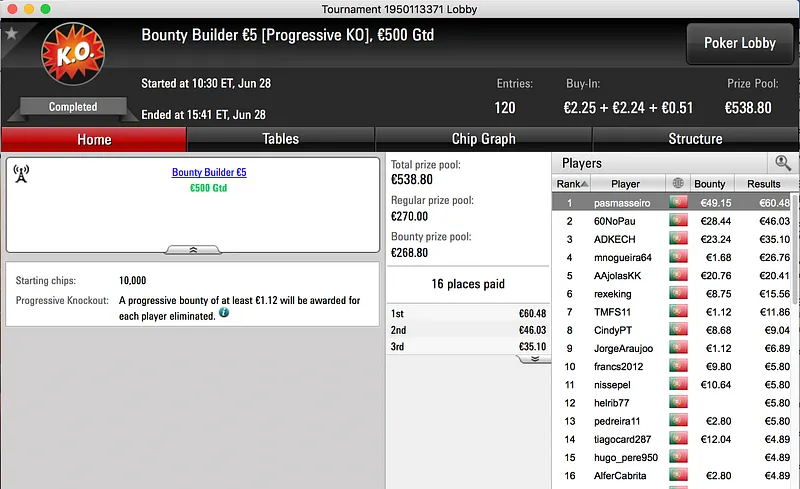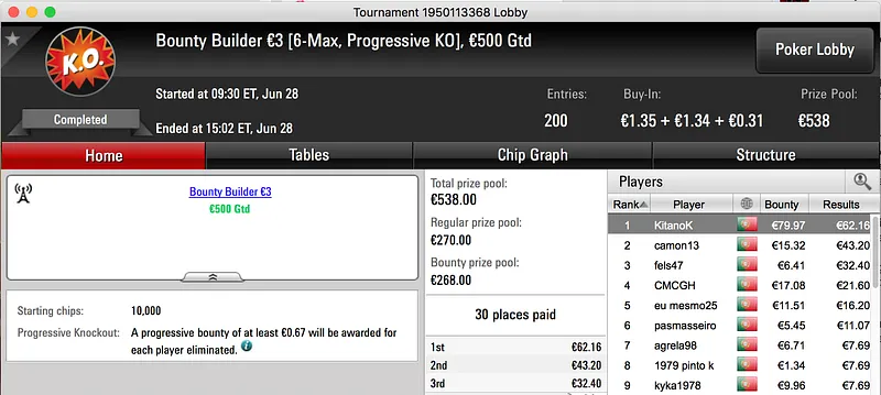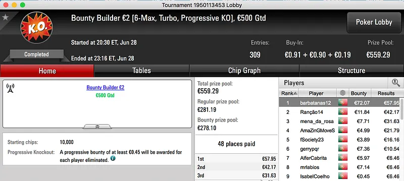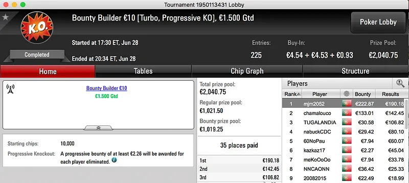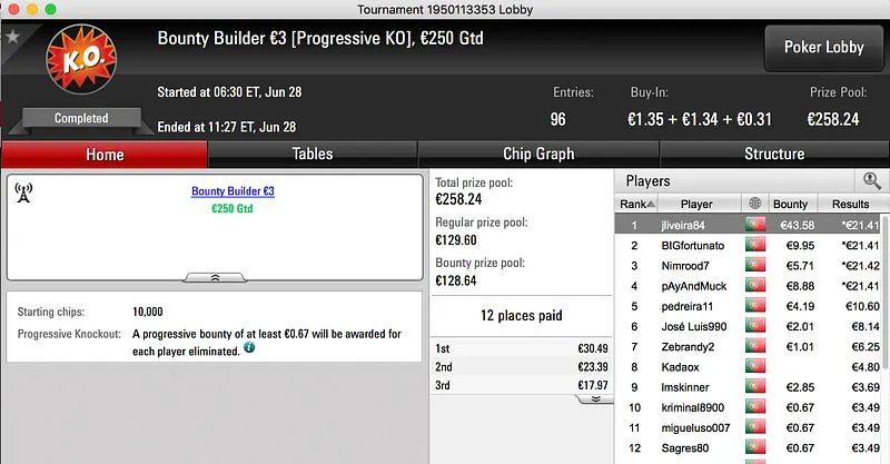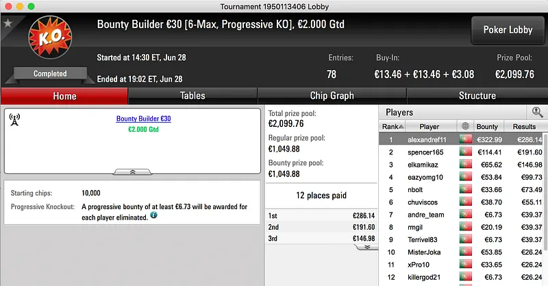 Por último, o bronze ficou na posse de alexandref11, faturou €609 com vitória no Bounty Builder €30.