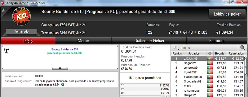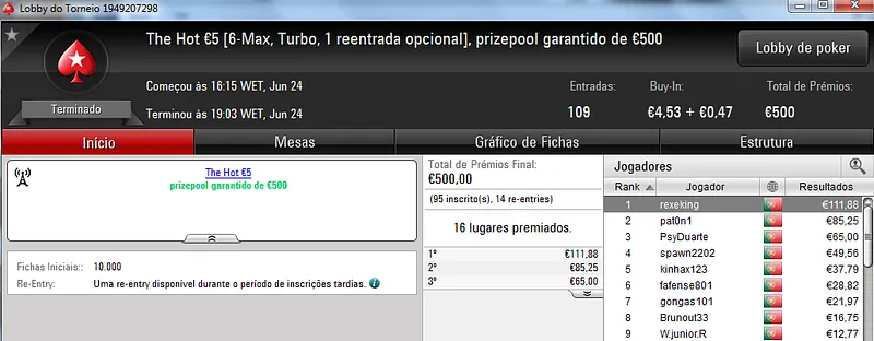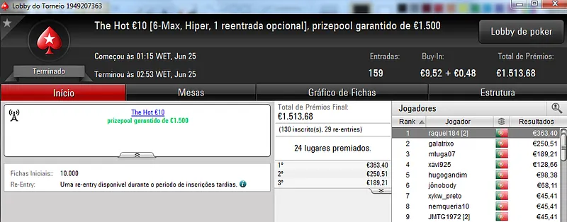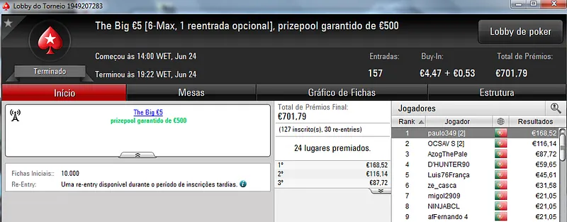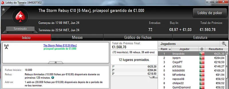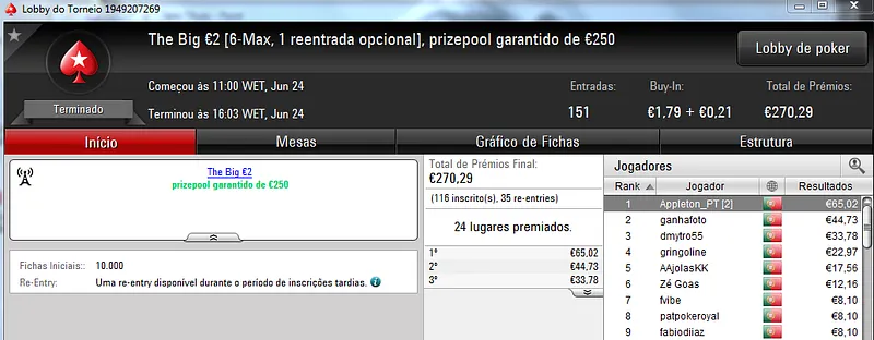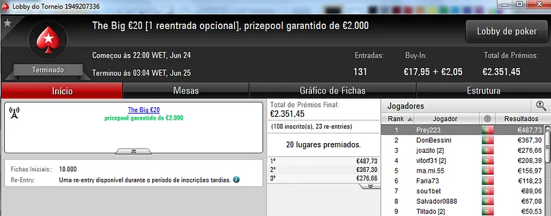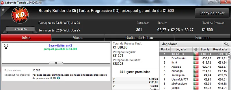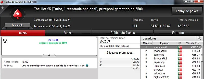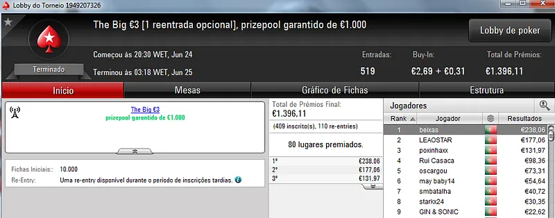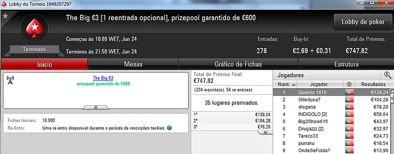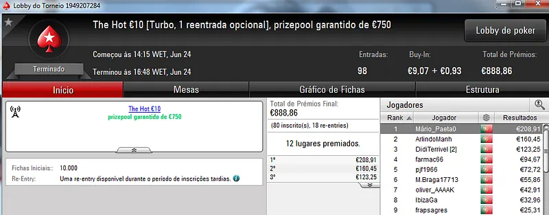 As posições quase se inverteram no caso de QuimDiamond. Ele venceu o The Big €100 para receber €872 e ainda acrescentou, não o segundo lugar, mas sim, o 5º no The Hot BigStack Turbo €50 para levar mais €214. No total faturou €1,086 nestes dois torneios.