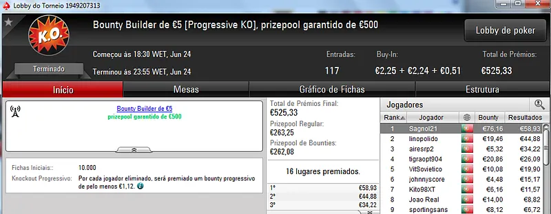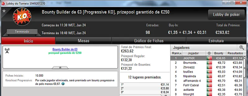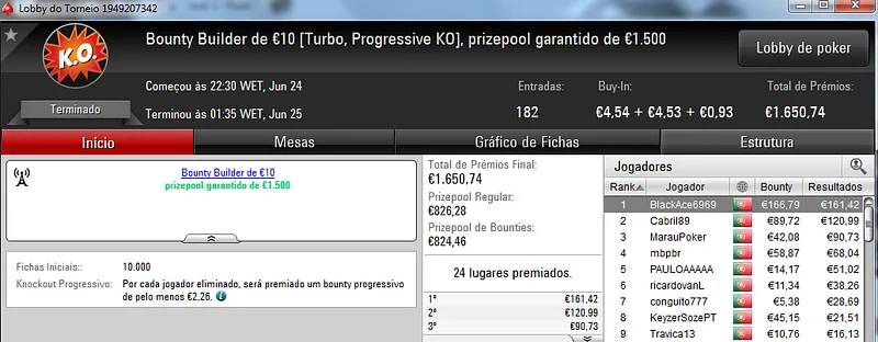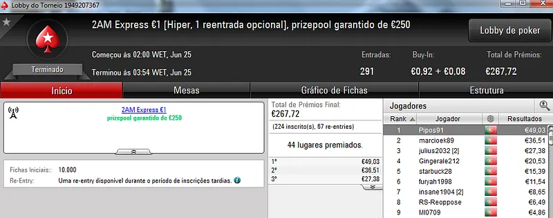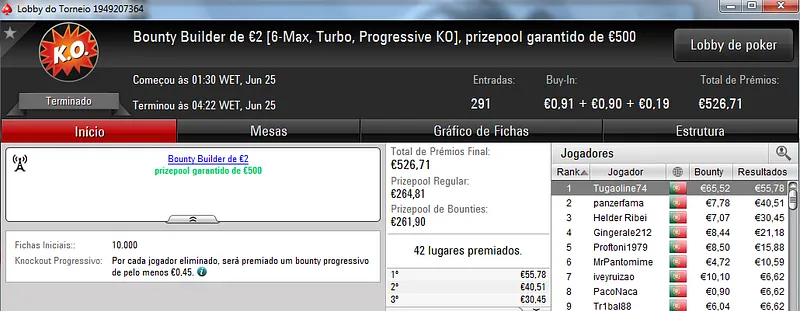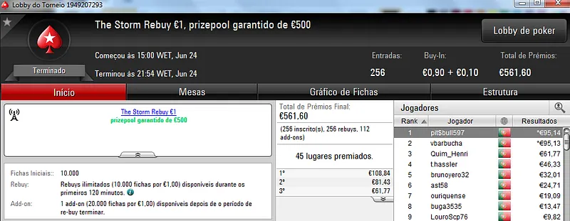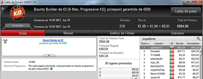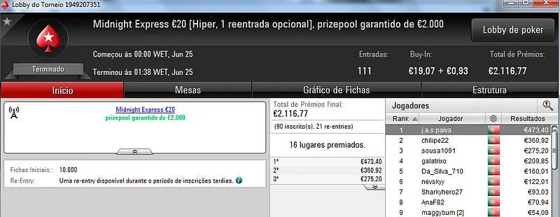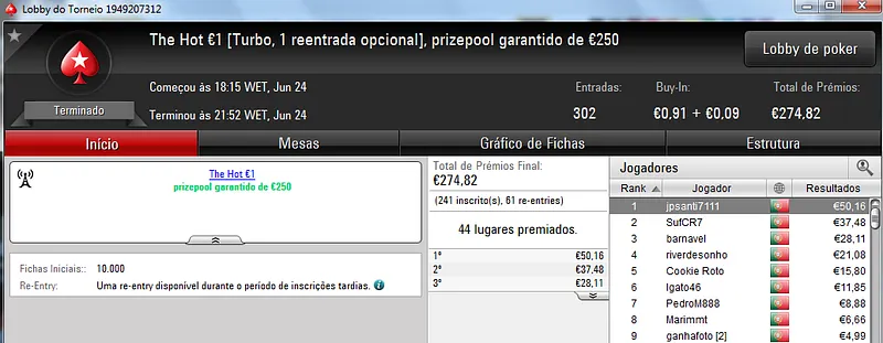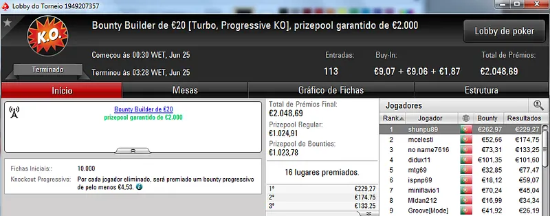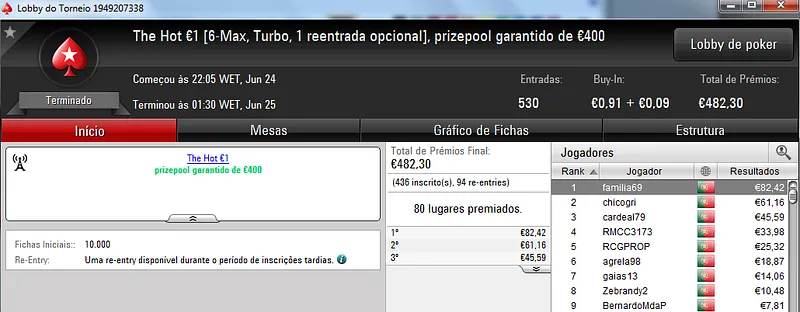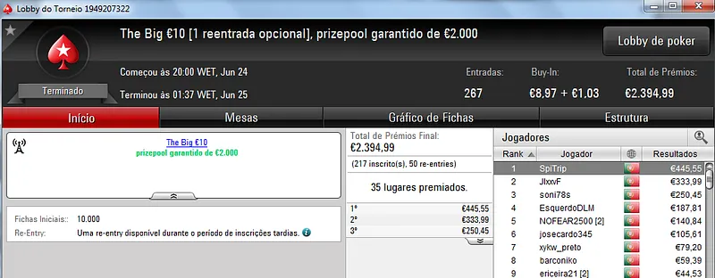As posições quase se inverteram no caso de QuimDiamond. Ele venceu o The Big €100 para receber €872 e ainda acrescentou, não o segundo lugar, mas sim, o 5º no The Hot BigStack Turbo €50 para levar mais €214. No total faturou €1,086 nestes dois torneios.