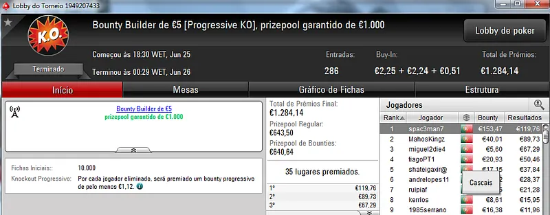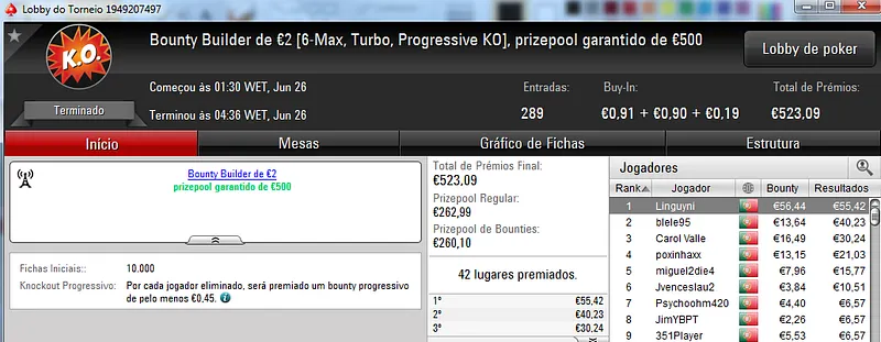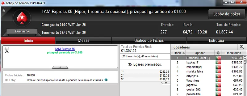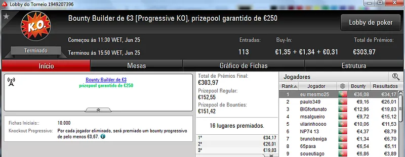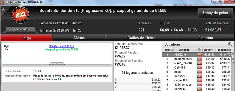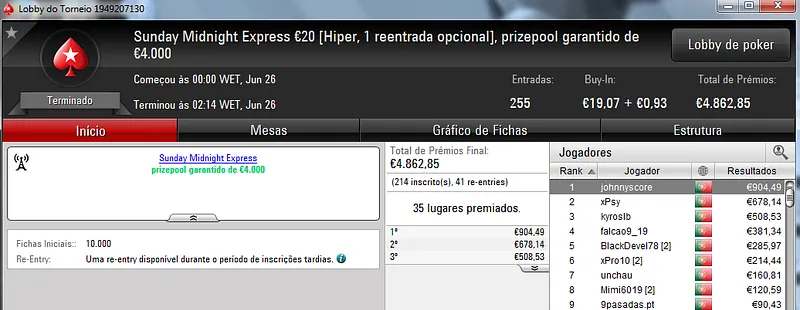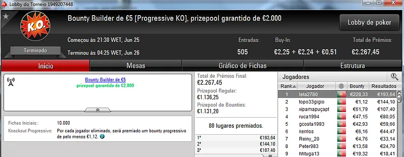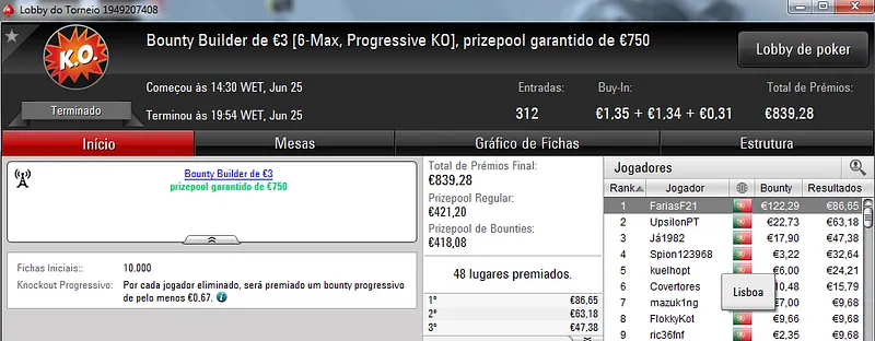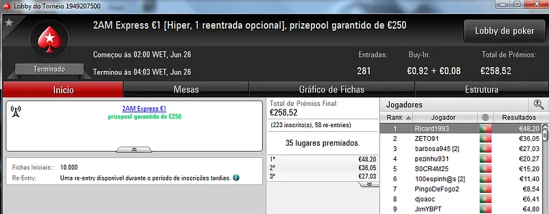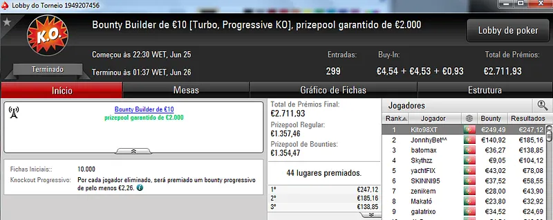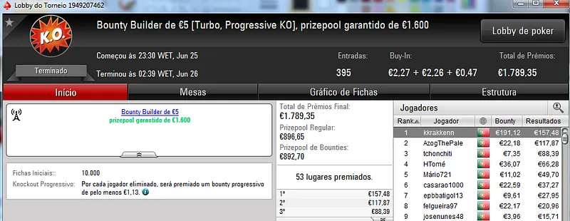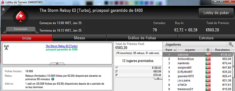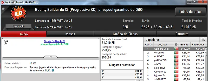 O Sunday Battle €30 foi vencido por Kito98XT que depois de realizar acordo no heads-up faturou €1,105. Na segunda posição nazgra embolsou €798, enquanto Pedro "pepasscp" Palma Ferro recebeu €513 entre prémio e bounties. O torneio contou com 243 entradas e um prize pool de €6,541.