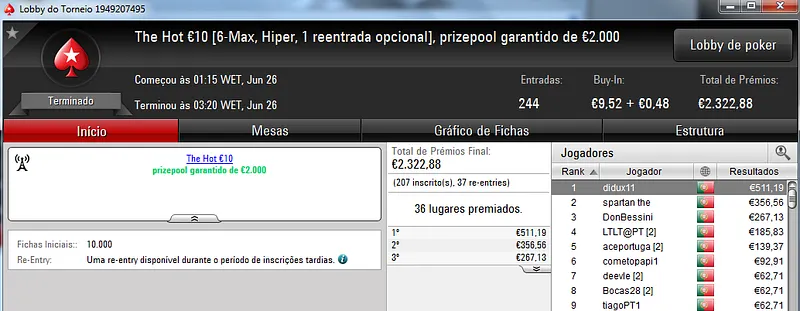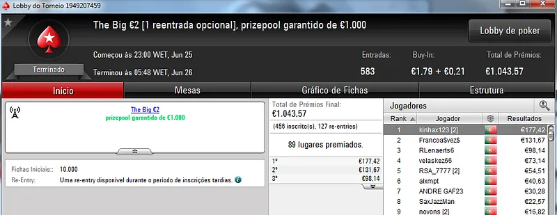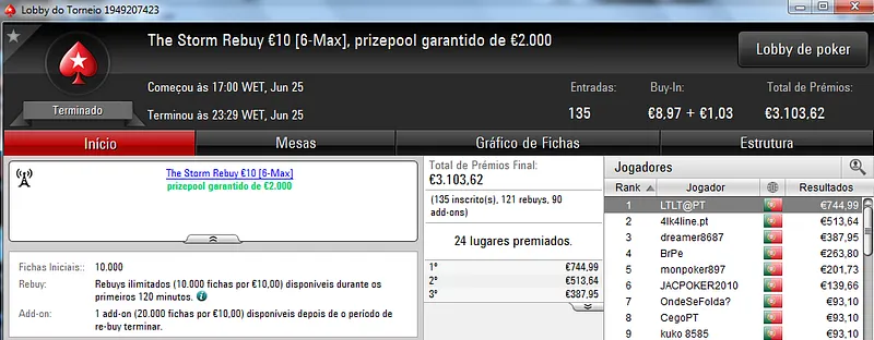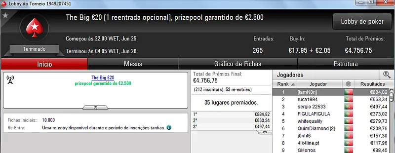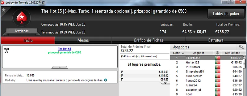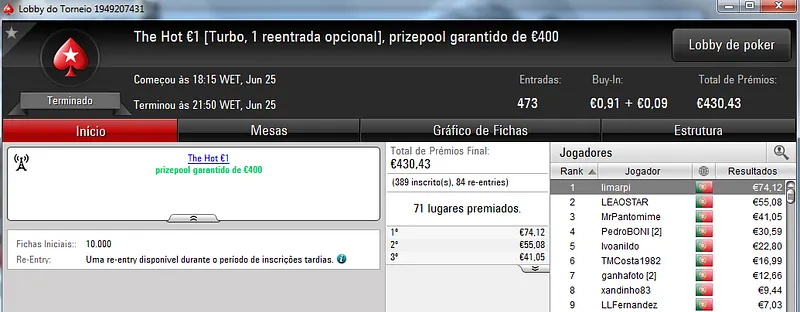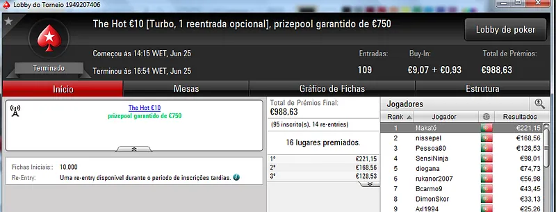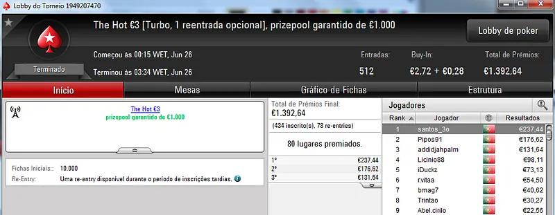 Mesmo com os torneios especiais de domingo, o The Hot BigStack Turbo €50 foi o torneio que atribuiu o maior prémio da sessão. Podemos dizer que foi um grande fim-de-semana para zenikem que fez back-to-back neste torneio para receber ontem €1,719 pelo primeiro lugar. Na segunda posição terminou sanxx0 que levou €1,185 para casa. O pódio fica completo com jmsdinis10 que recebeu €895 pelo terceiro posto.