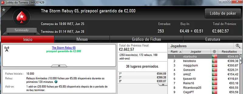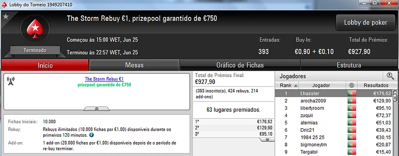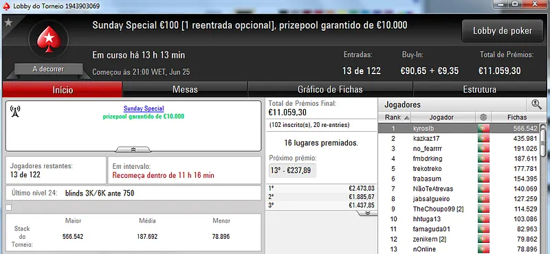 Hoje vão-se realizar o dia 2 do Sunday Storm €10 e do Sunday Special €100, em jogo estão mais de €20 mil.