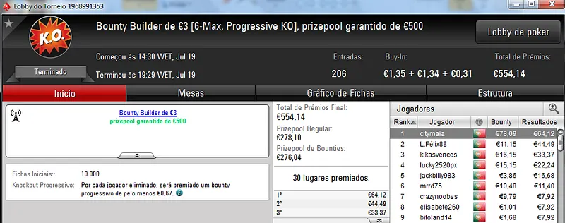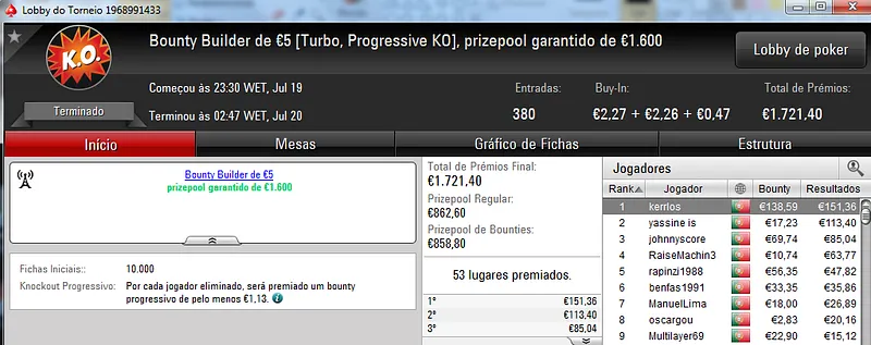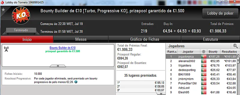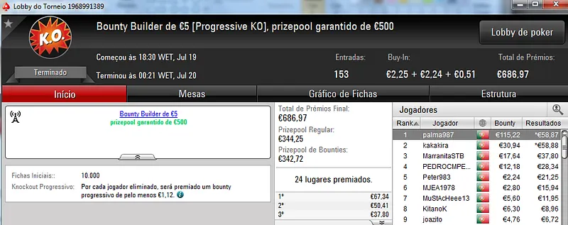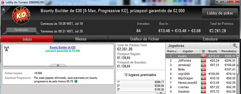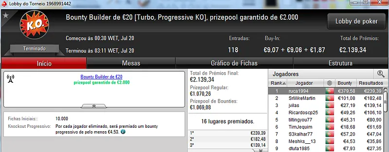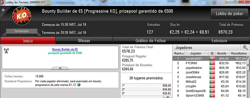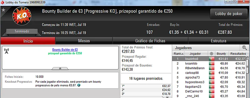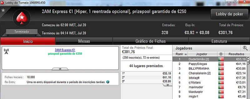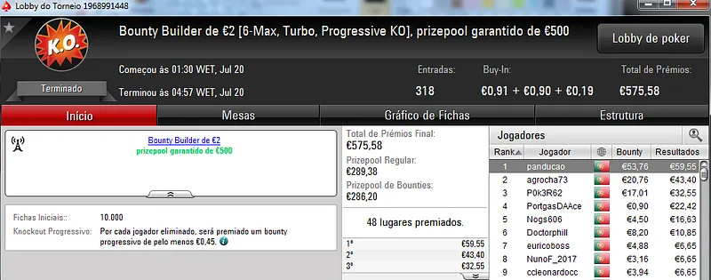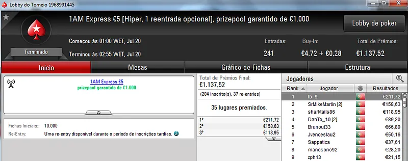 No total, TiJoao amealhou €1,517 nestes 4 torneios regulares da PokerStars.pt.