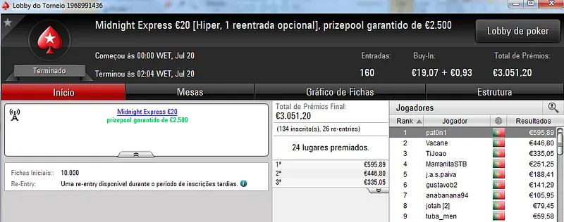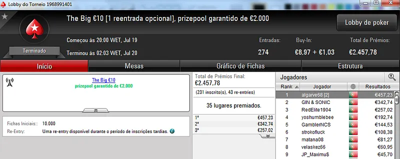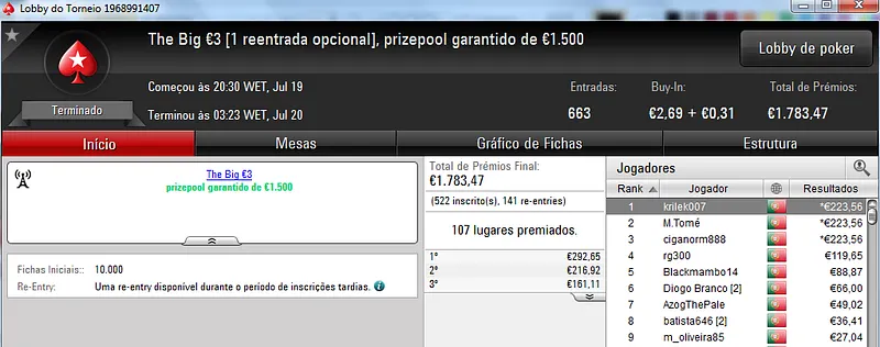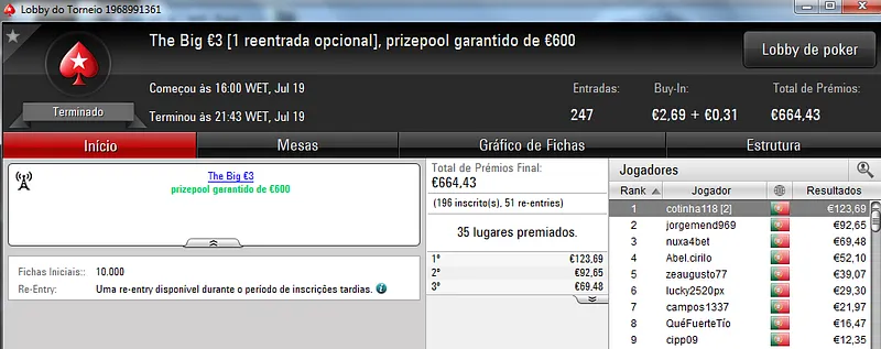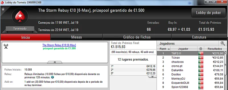 Não podíamos terminar a notícia sem fazer uma menção a TiJoao. Além de vencer o The Big €50 com 34 entradas onde recebeu €564, ainda levou para casa €312 pelo 2º lugar no The Storm Rebuy €10, €306 pelo 5º lugar no The Hot BigStack Turbo €50 e €335 pelo 3º posto no Midnight Express €20.