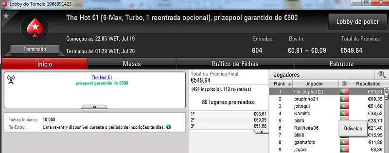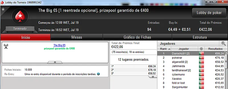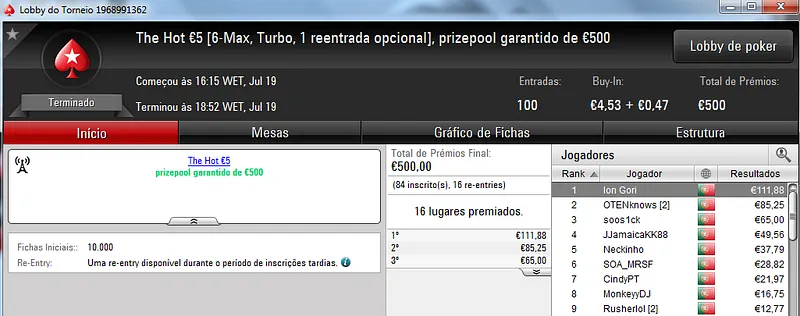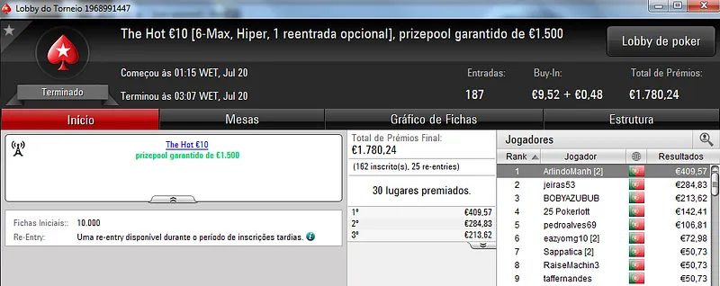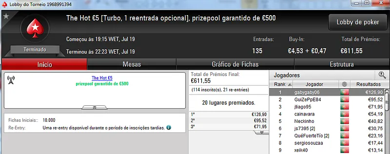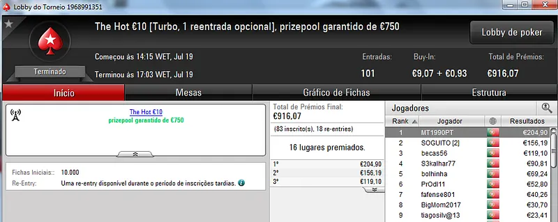 O The Hot Big Stack Turbo €50 contou com 104 entradas que perfizeram o prize pool acumulado de €4,714. Na primeira posição, kazkaz17 levou o maior prémio do dia ao receber €1,225. No segundo posto, SuSanch0 faturou €825. O terceiro lugar ficou a cargo de 23filipa que recebeu €612.