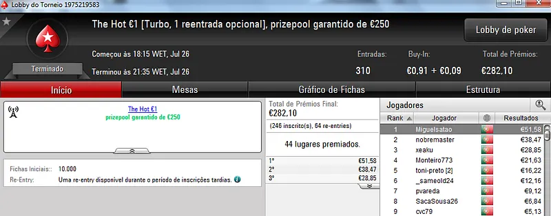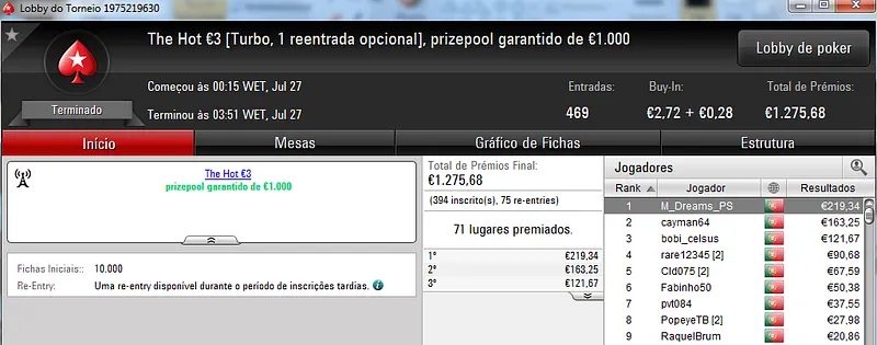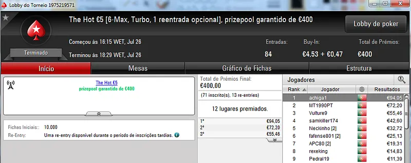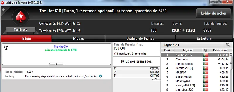 Ontem, as 84 entradas registadas no The Hot BigStack Turbo €50 não chegaram para completar o prize pool garantido de €4,000 no torneio. Assim, os prémios foram distribuídos pelos 12 melhores classificados, onde quem se impôs foi Bartolini01 que faturou €1,090. Bartolini01 foi o melhor jogador depois de vencer fredmd no heads-up que recebeu €730. A completar o pódio, flucas672 encaixou €560.