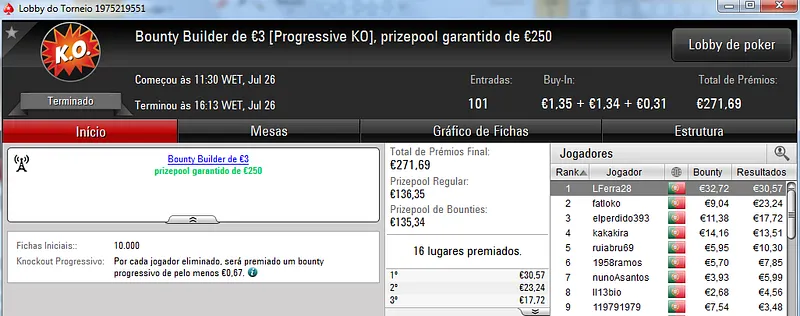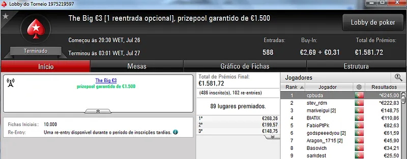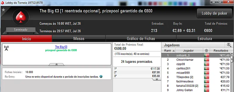 No The Big €100 o prize pool chegou aos €3,354 e foi distribuído pelos 9 melhores jogadores. Filipa2007 levou a melhor e recebeu €1,006 pelo primeiro posto. Na segunda posição, jorgemend969 recebeu €670, enquanto Wgakiters recebeu €503 no terceiro lugar.