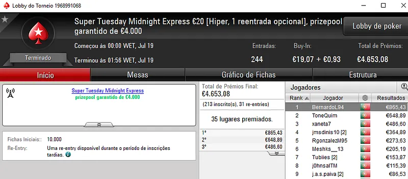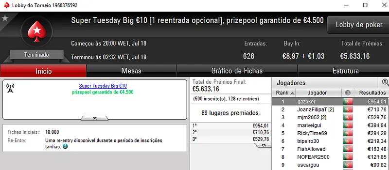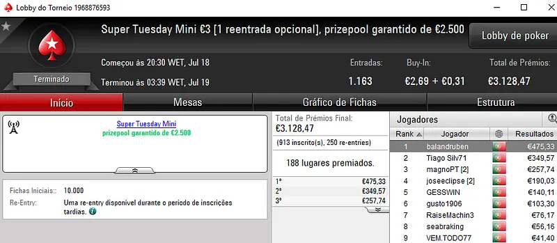 O Super Tuesday €100 contou com 75 registos. O prize pool garantido de €7,500 não foi superado e os prémios foram distribuídos pelos 12 melhores jogadores. O maior beneficiário foi bossxenas que levou €1,762 pelo primeiro lugar da classificação. O segundo posto ficou a cargo de sakavac18 que faturou €1,353 de prémio. O terceiro lugar do pódio ficou para NeverLoose62 que levou o último prémio na ordem de 4 dígitos entregue neste torneio, cerca de €1,039.