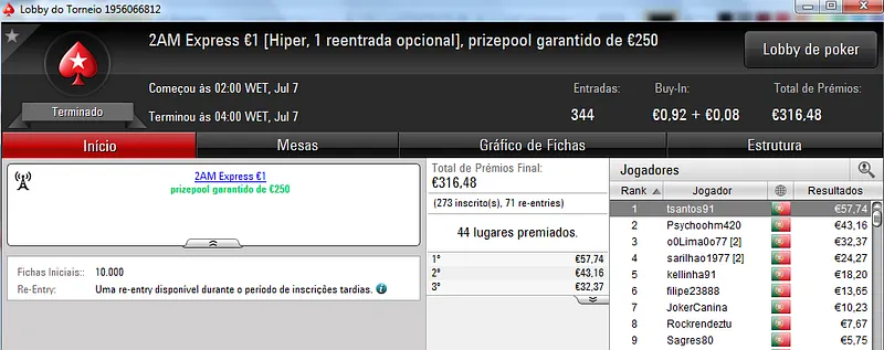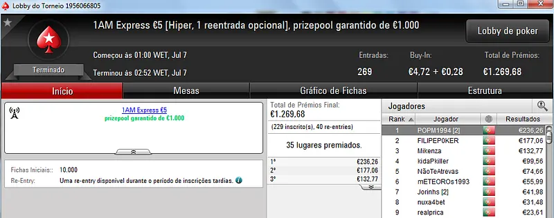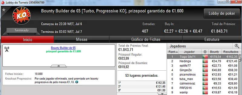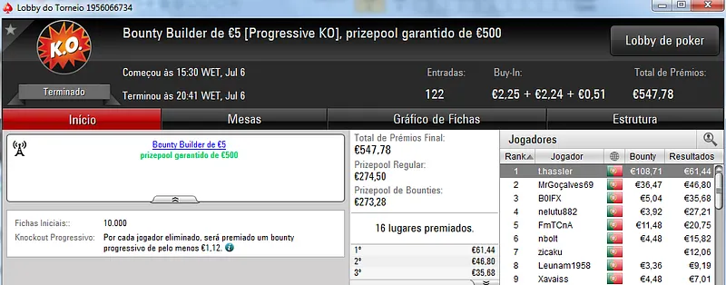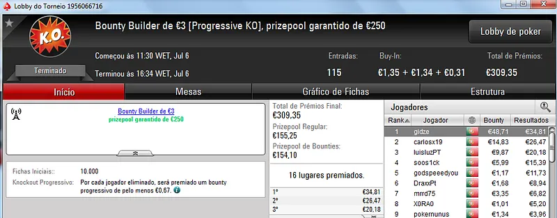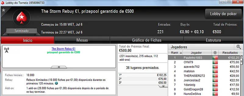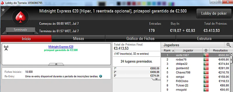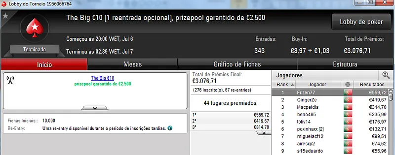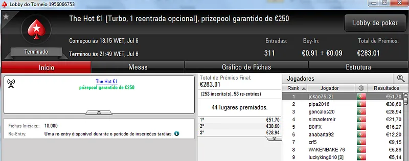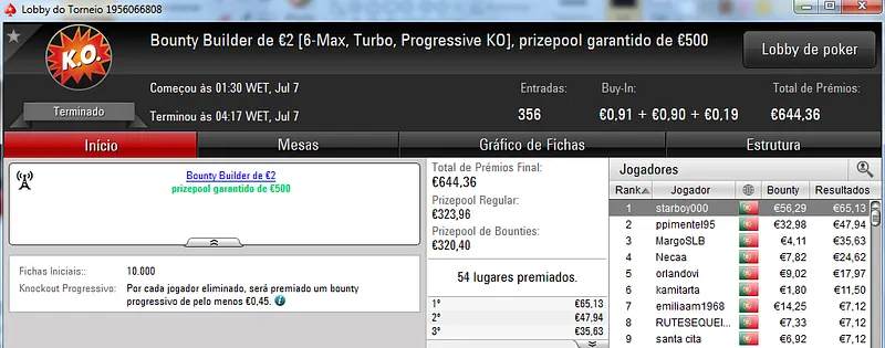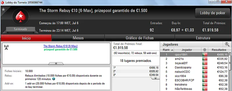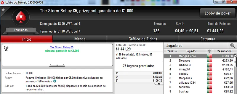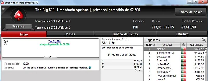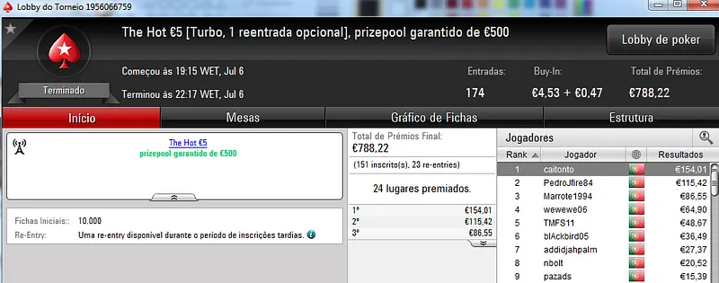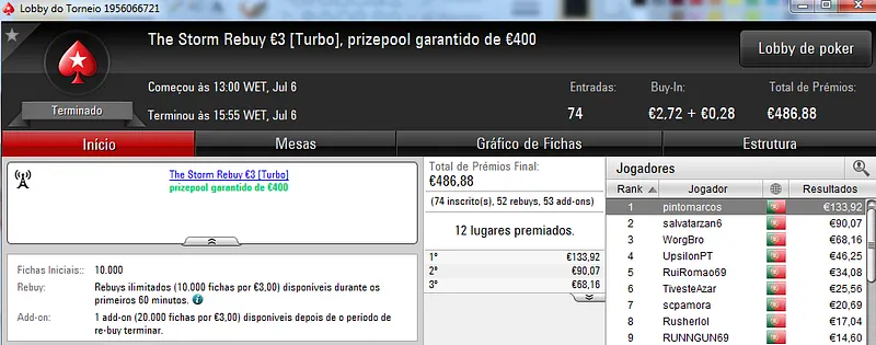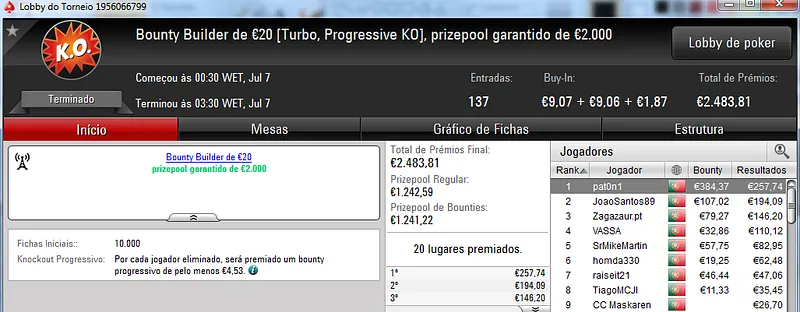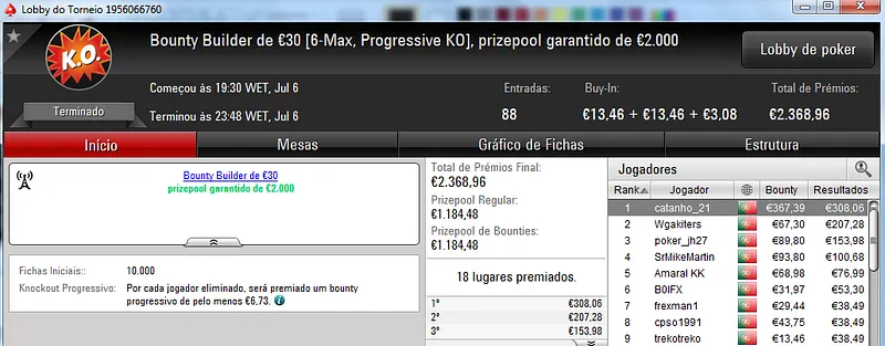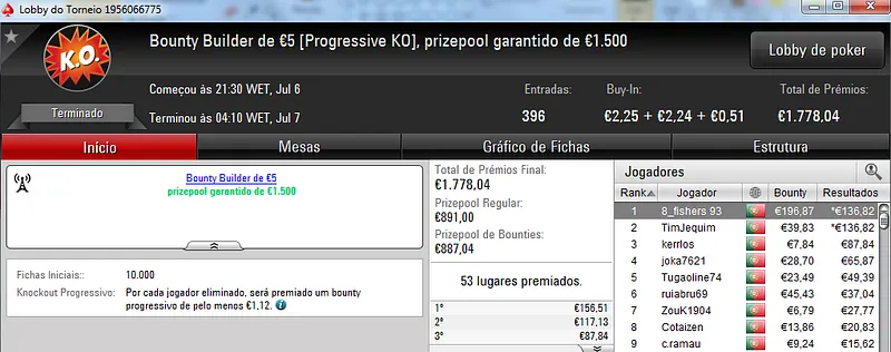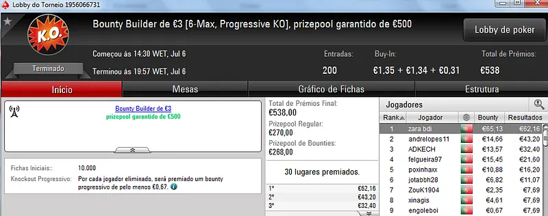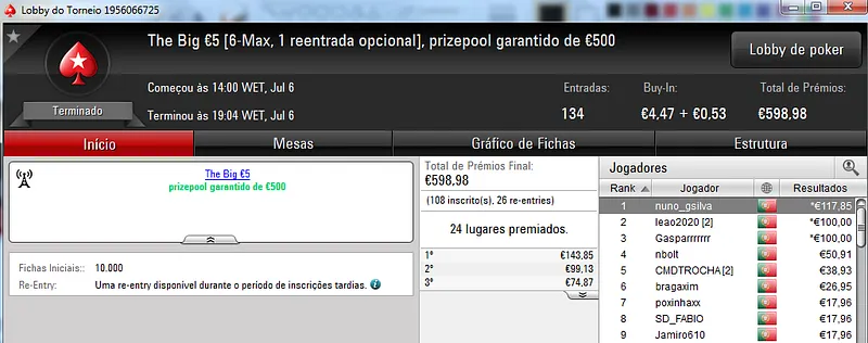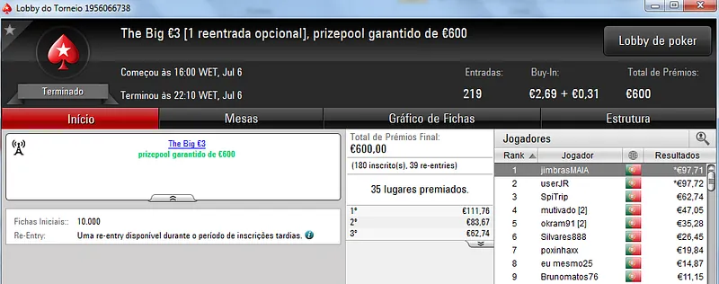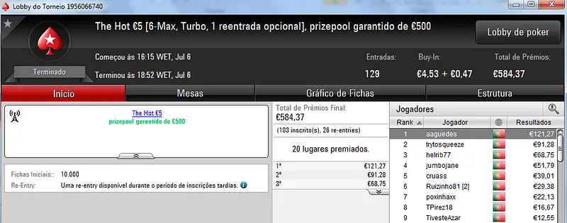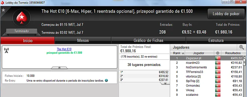 Destaque ainda para Zagazaur.pt que foi quinto neste torneio onde recebeu €338, mas ainda acrescentou vários resultados noutros torneios. Faturou €455 pelo primeiro lugar no The Hot €10, €374 pelo terceiro lugar no The Big €20 e ainda €225 pela terceira posição no Bounty Builder €20. No total, Zagazaur.pt encaixou €1,392 nestes 4 torneios.