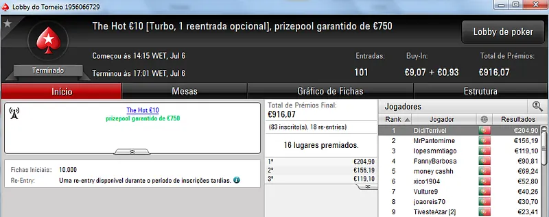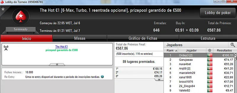 Quem recebeu esse prémio foi FannyBarbosa que conquistou o The Hot BigStack Turbo €50 com 115 entradas. O prize pool deste torneio chegou aos €5,212 que foi repartido pelos 18 melhores jogadores. No segundo posto, xaneta7 recebeu €912.