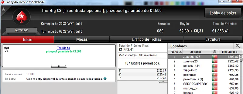 FCGrosso83 ainda acumulou mais um título no The Big €50 onde saiu com €619. No total recebeu €1,369 nestes dois torneios.