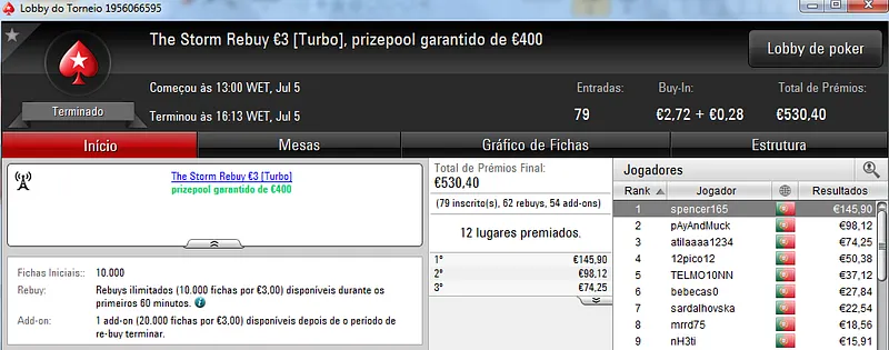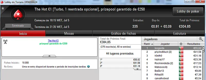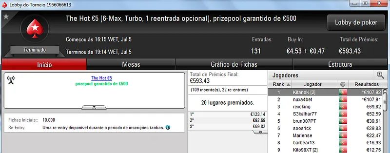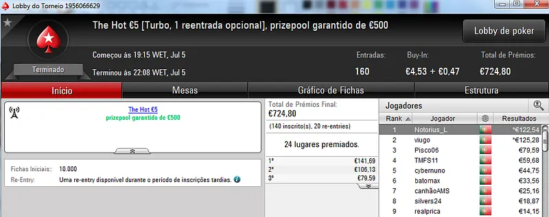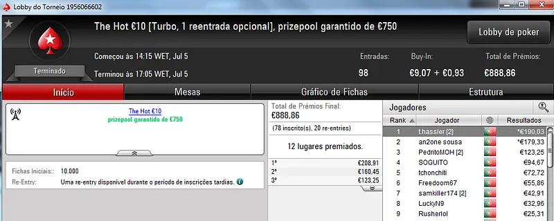 O maior prémio foi entregue no The Hot BigStack Turbo €50 onde participaram 79 jogadores que realizaram 17 reentradas. O prize pool chegou as €4,351 e foi distribuído pelos 18 melhores jogadores. Com a maior fatia saiu poker_jh27 que recebeu €1,131 pelo primeiro lugar. O heads-up foi disputado contra dreamer8687 que recebeu €761. A fechar o pódio FilipeLF encaixou €565.