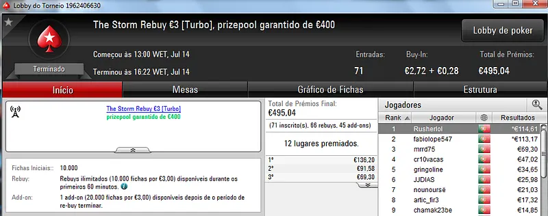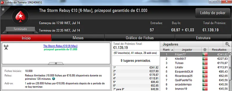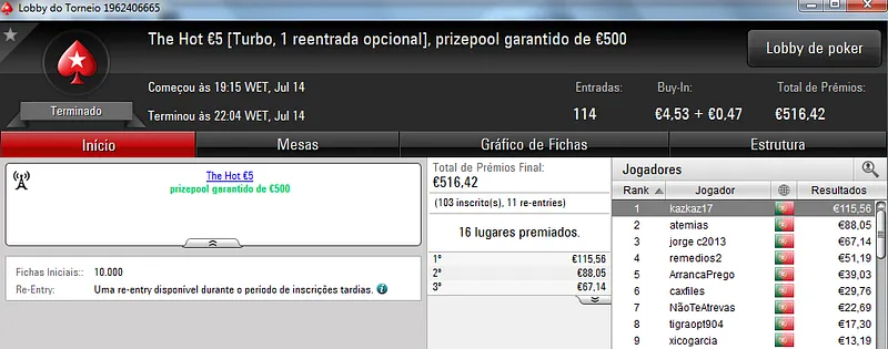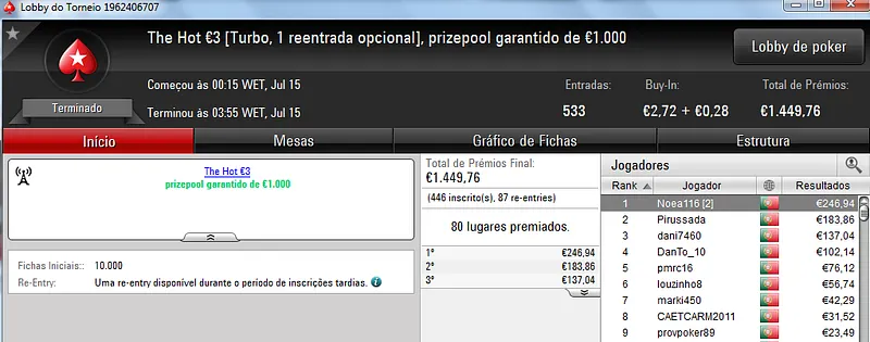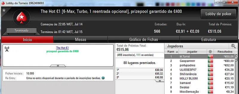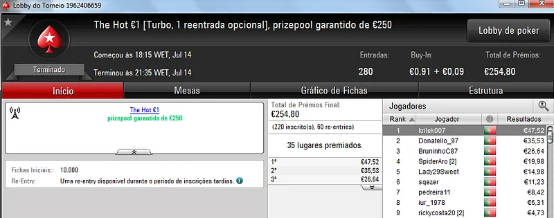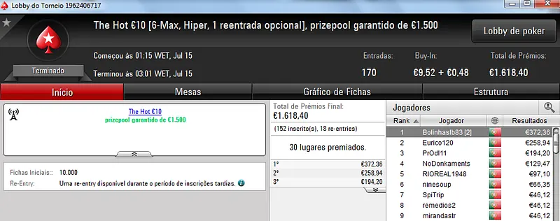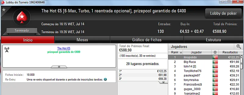 O The Hot BigStack Turbo €50 contou com 82 entradas que perfizeram um prize pool de €3,717 a ser distribuído pelos 12 melhores classificados. O acordo realizado no heads-up resultou em €818 para catanho_21 que ficou no primeiro posto e em €872 para NãoTeAtrevas no segundo lugar. No terceiro lugar do pódio, pasmasseiro recebeu €520 de prémio.