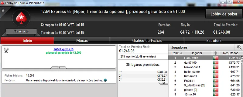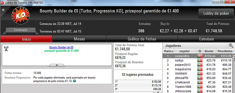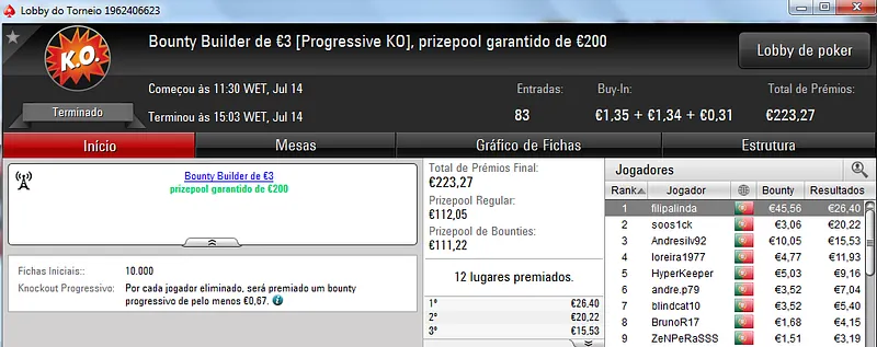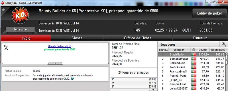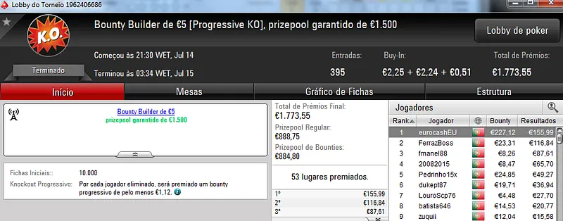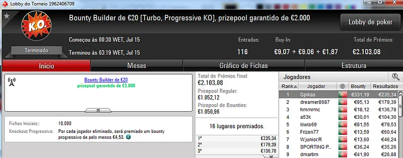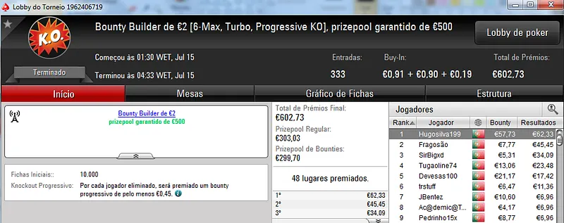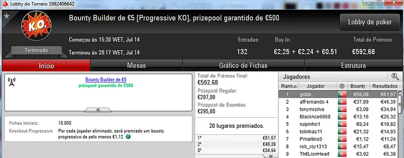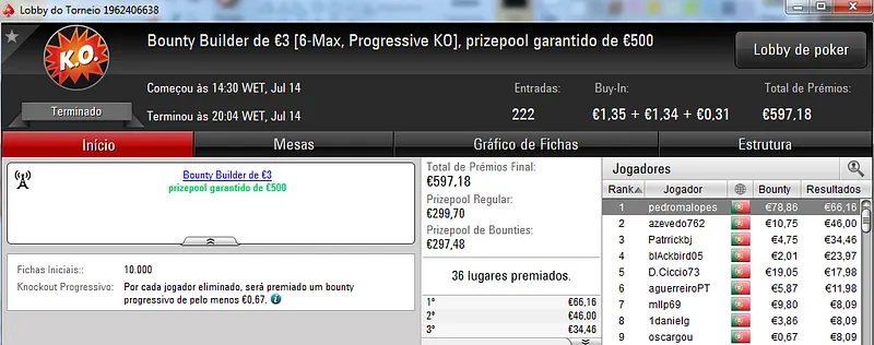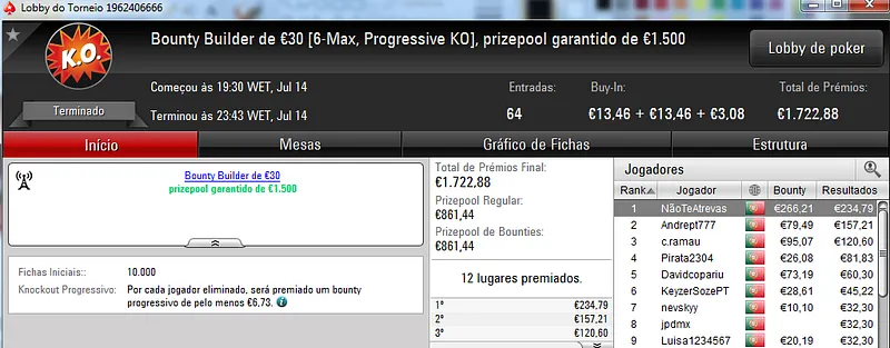 NãoTeAtrevas ainda assegurou a vitória no Bounty Builder €30 onde recebeu mais €500, que resulta em €1372 em prémios nos dois torneios.