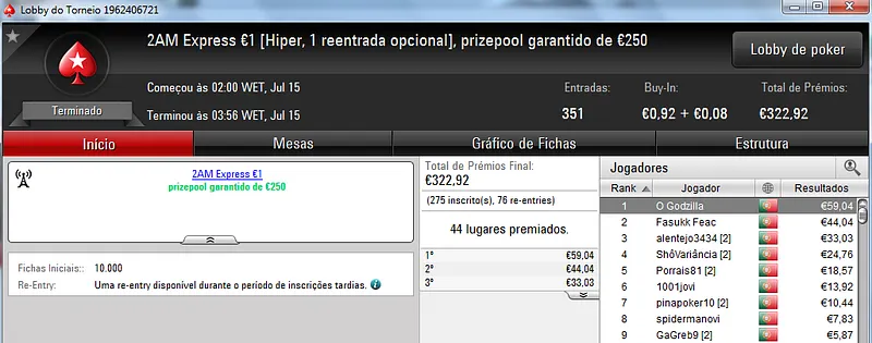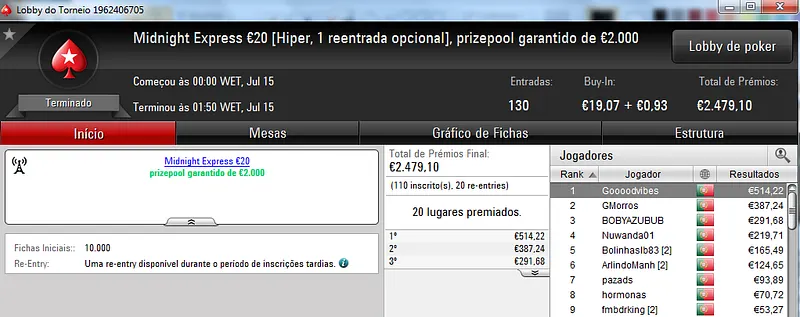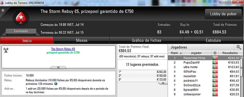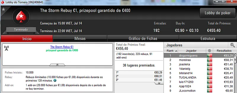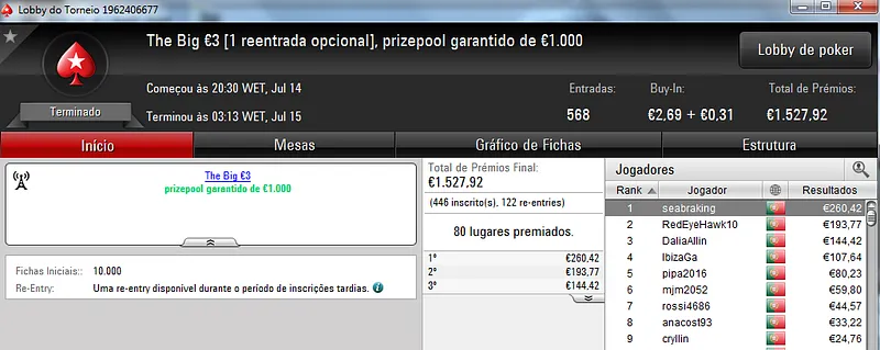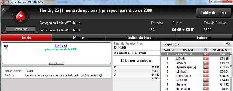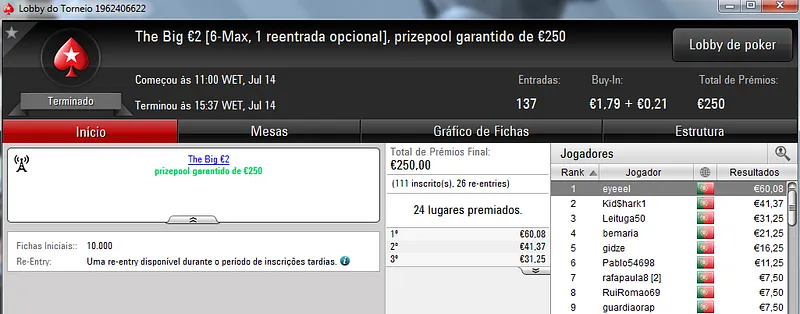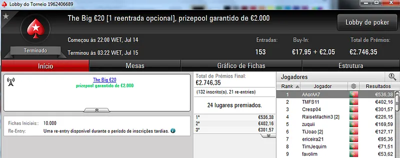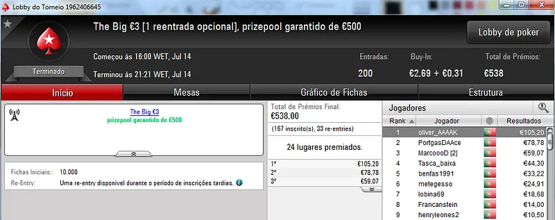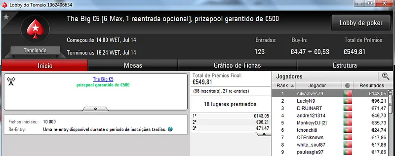 Situações à parte, o maior prémio do dia foi entregue no The Big €100 com 28 entradas e €2,538 de prize pool. O campeão nunomimosa20 levou para casa €939 depois de sair vitorioso deste torneio. Na segunda posição, TiJoao juntou mais €634 aos €127 ganhos pelos sexto lugar no The Big €20, e aos €170 pelo terceiro lugar no The Storm Rebuy €10 (€931 no total). Já o terceiro posto ficou a cargo de KeyserSosePT que arrecadou €380 e prémio.