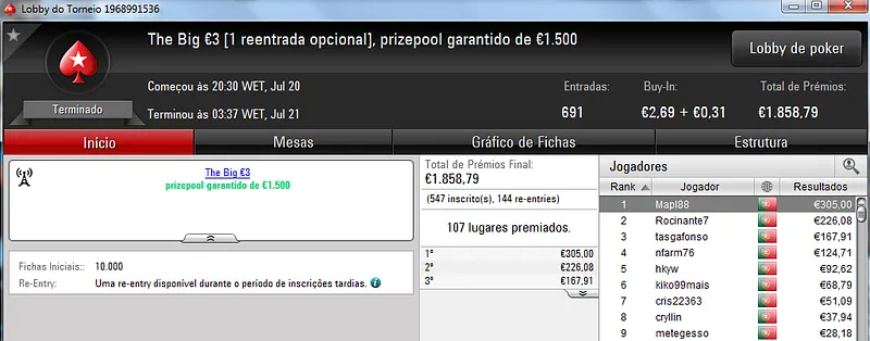 Já o The Big €100 contou com 29 registos que não perfizeram o prize pool garantido. Quem beneficiou com isto foi JJamaicaKK88 que saiu com o título e €1,110 de prémio neste torneio. O segundo posto ficou a cargo de ajjboss que faturou €750. Em terceiro lugar, galatrixo recebeu €450.