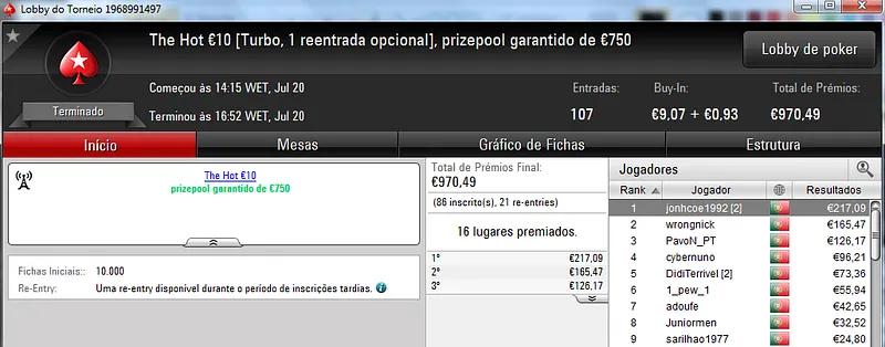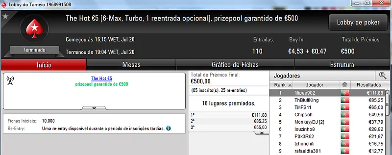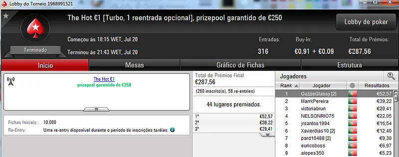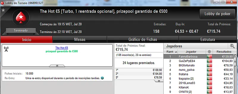 O grande resultado veio no The Hot BigStack Turbo €50 com 95 entradas e €4,306 de prize pool. NeverLoose62 saiu vitorioso e arrecadou €1,119 neste torneio. Na segunda posição, BrPe levou €753. O pódio fica fechado com M.Freitas441 que recebeu €559 pelo terceiro posto.