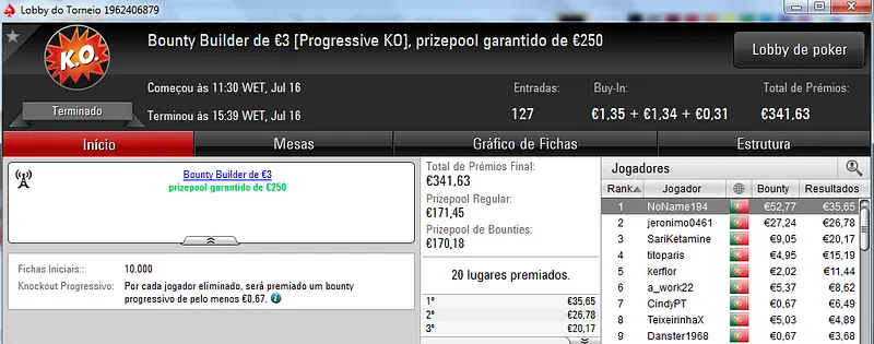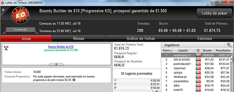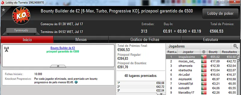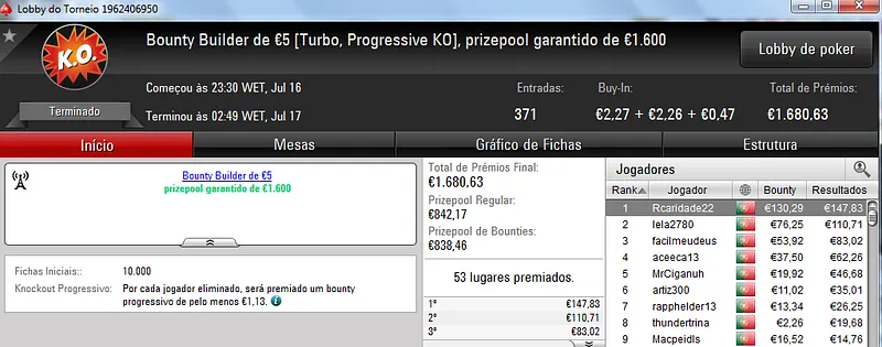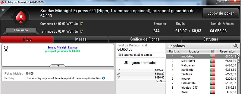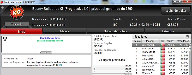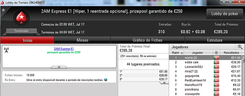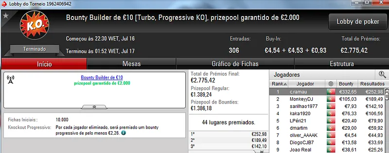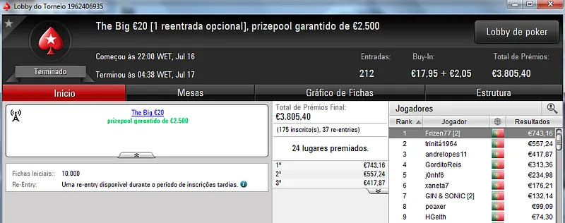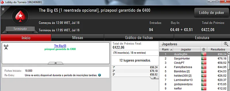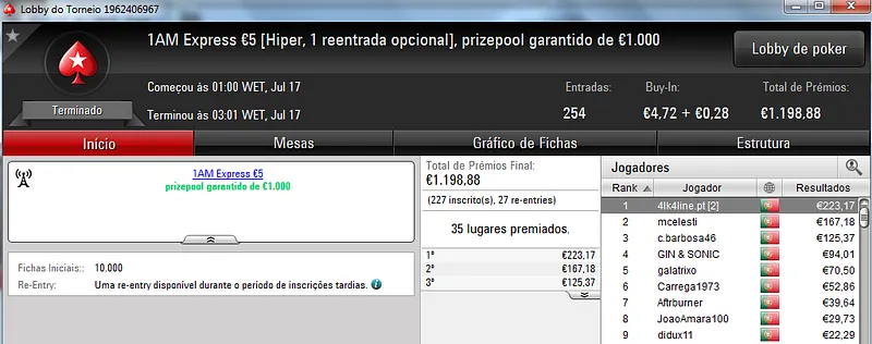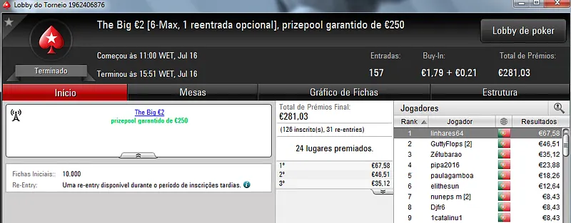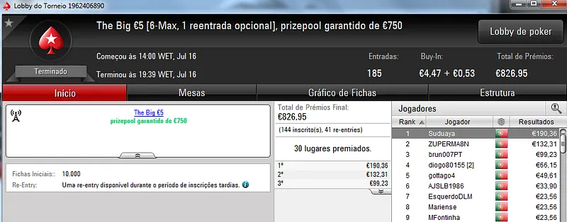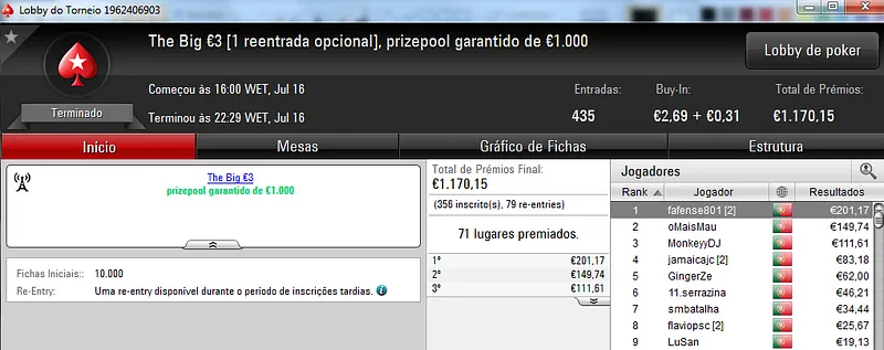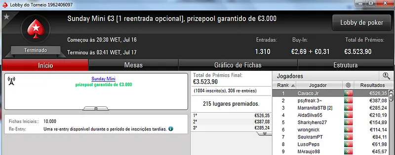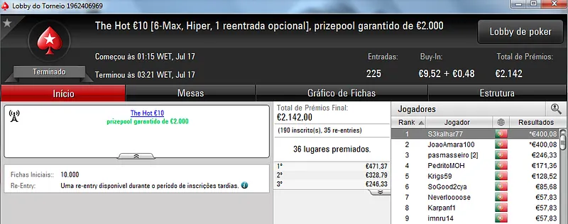 Ontem houve mais uma grande sessão de poker online na PokerStars.pt com 6 jogadores a saírem com prémios de 4 dígitos dos torneios regulares.