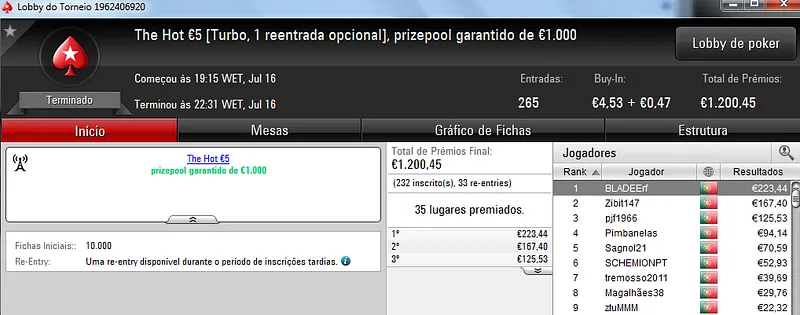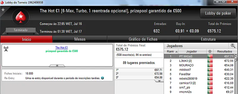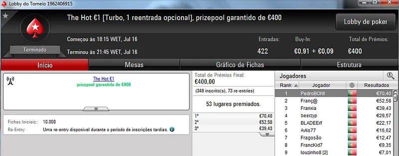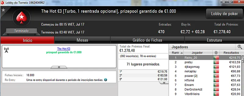 RubenBrek foi o que recebeu o prémio mais chorudo. O The Hot BigStack Turbo €50 contou com 148 entradas que perfizeram um prize pool de €6,708. A maior fatia ficou para RubenBrek que recebeu €1,610. No segundo posto an2one sousa levou para casa €1.110 aos quais ainda acrescentou €465 no Sunday Warm-Up €50, onde terminou na quita posição. A completar o pódio, gustavob2 recebeu €838 pelo terceiro lugar.