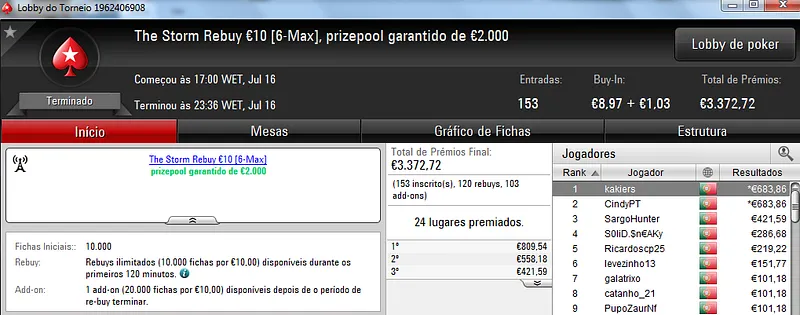 O Sunday Battle €30 viu levezinho13 fazer uma autêntica caça ao bounty e levar €961 só em eliminações. O jogador ainda juntou mais €573 de prémio para no total receber €1,534. No segundo posto, kakiers recebeu €504 que juntou à vitória no The Storm Rebuy €10 que lhe valeu €683. Com o terceiro lugar do pódio, c.ramau levou €379 para casa.