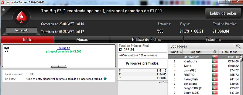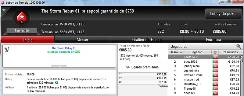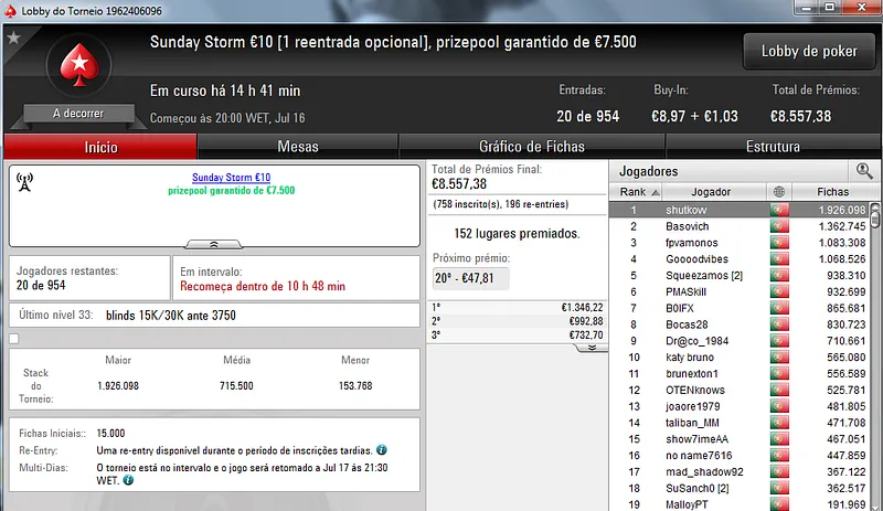 Hoje vão-se realizar o dia 2 do Sunday Storm €10 e do Sunday Special €100, em jogo estão mais de €20 mil.