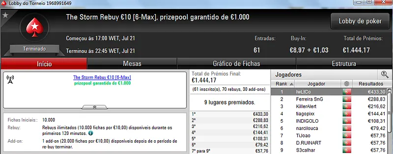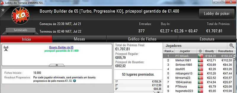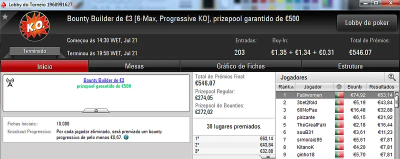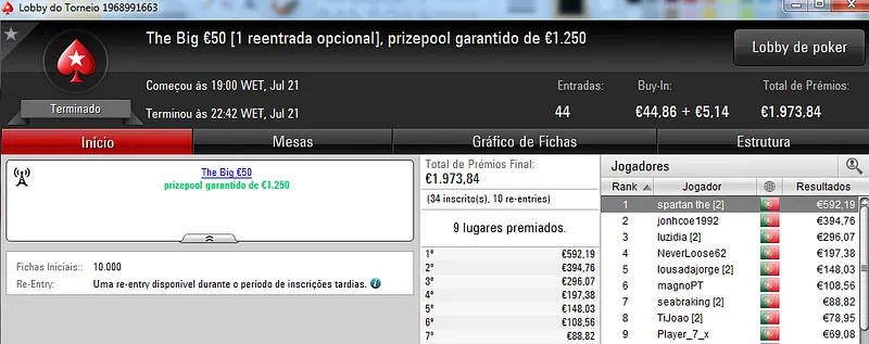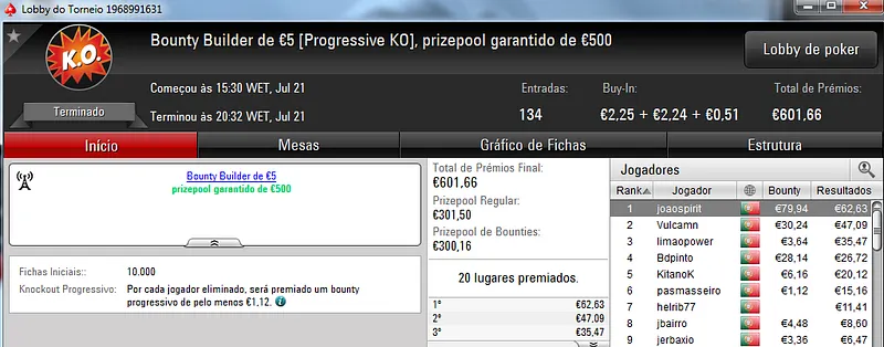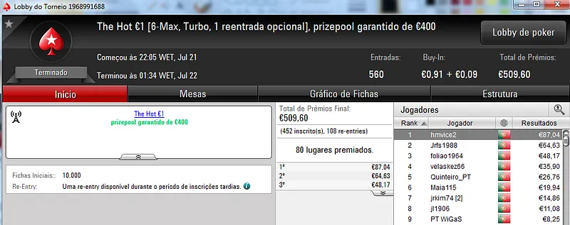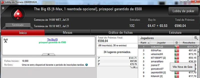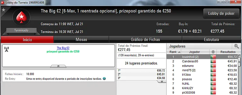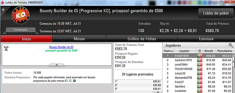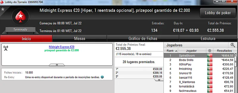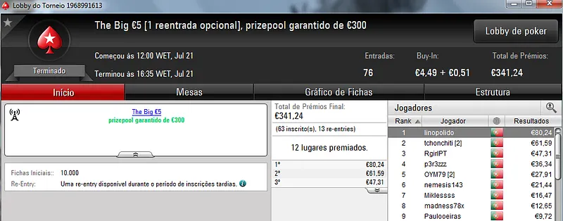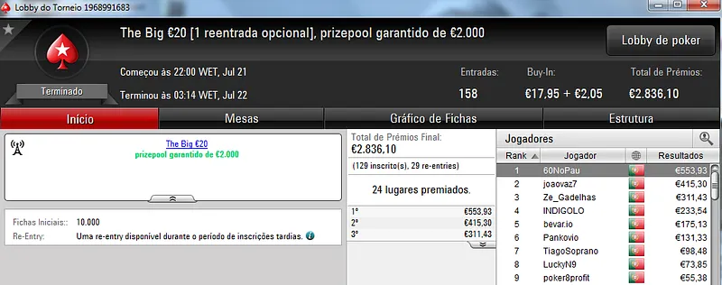 Não podíamos terminar se deixar de referir 60NoPau que recebeu €553 pela vitória no The Big €20 e ainda acrescentou dois terceiros lugares no Bounty Builder €20 e no Midnight Express €20 que lhe valeram mais €212 e €300, respectivamente. No total, levou para casa €1,065 neste três torneios.