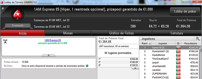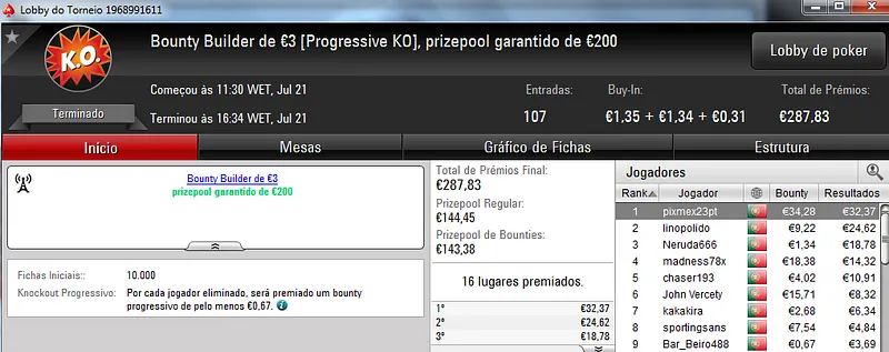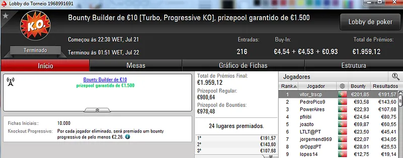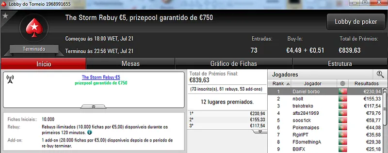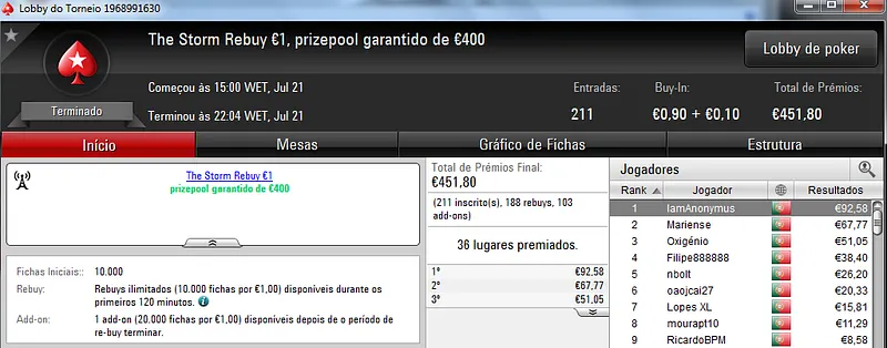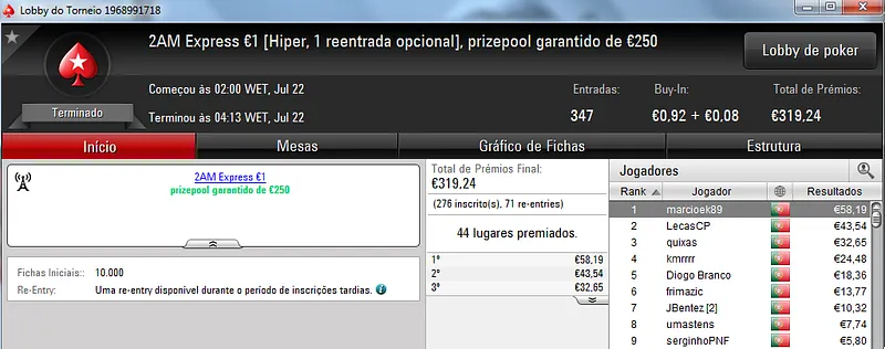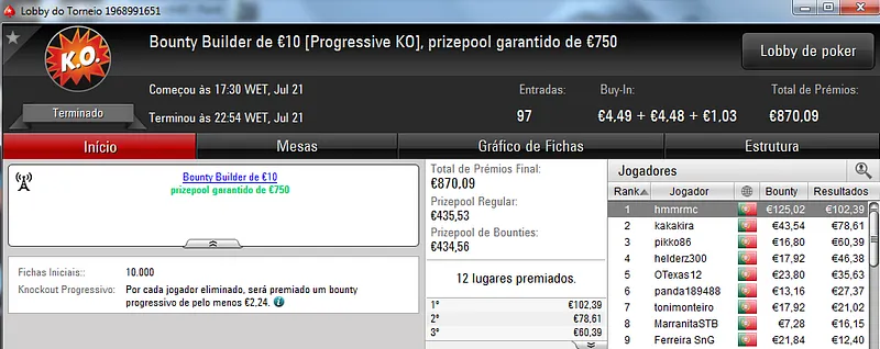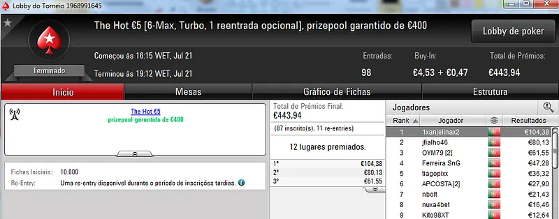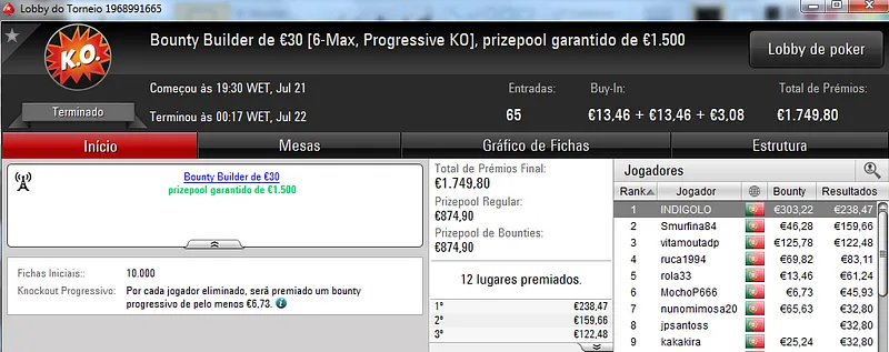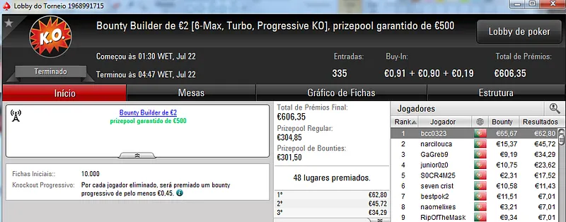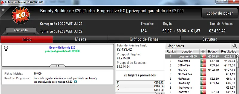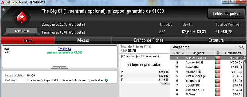 Não podíamos terminar se deixar de referir 60NoPau que recebeu €553 pela vitória no The Big €20 e ainda acrescentou dois terceiros lugares no Bounty Builder €20 e no Midnight Express €20 que lhe valeram mais €212 e €300, respectivamente. No total, levou para casa €1,065 neste três torneios.